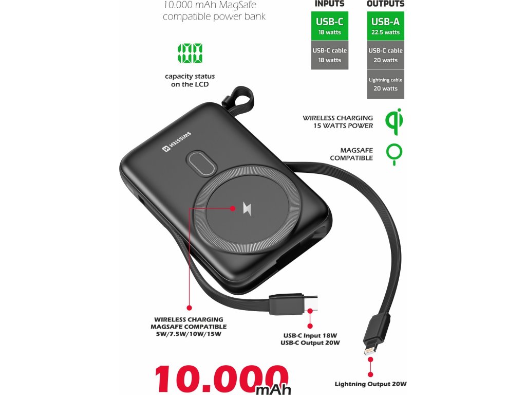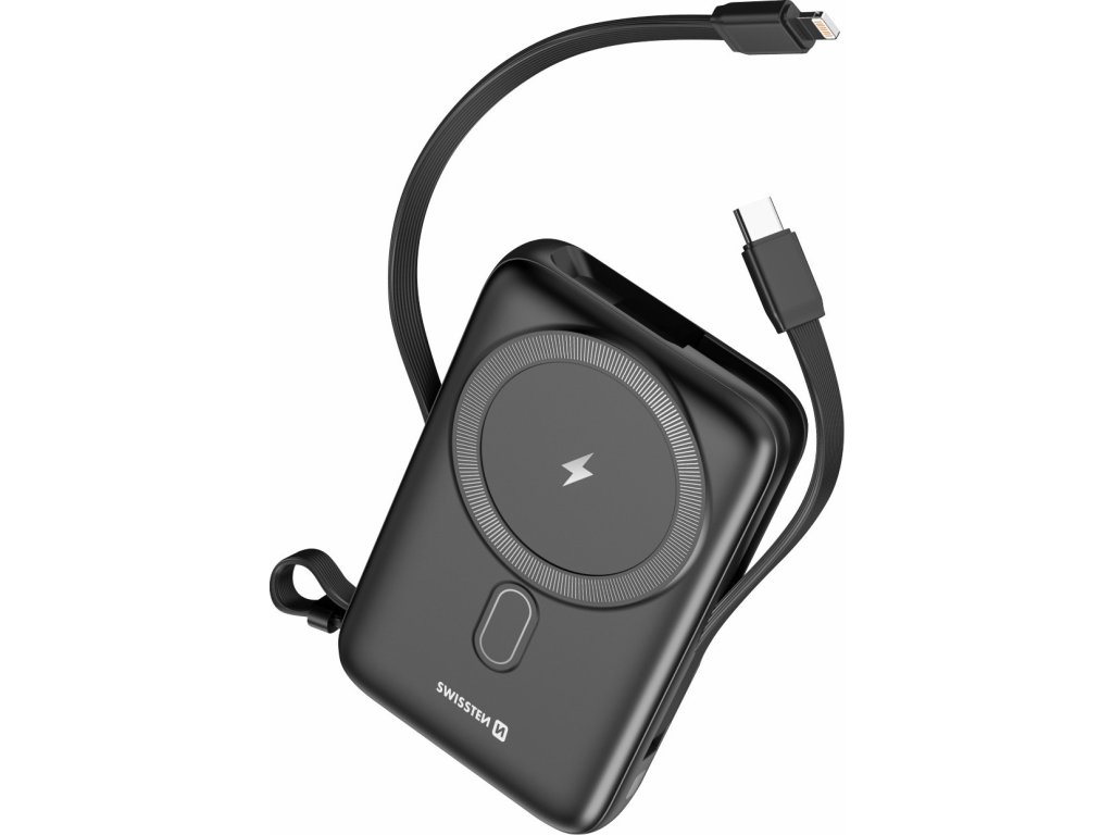 SWISSTEN POWER BANK 10000 mAh PD 20W s integrovanými káblami USB-C a Lightning (kompatibilný s MagSafe)