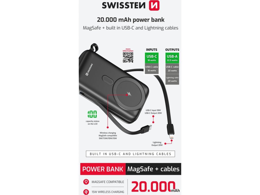 SWISSTEN POWER BANK 20000 mAh PD 20W S INTEGROVANÝMI KÁBLAMI USB-C A LIGHTNING (kompatibilný s MagSafe)