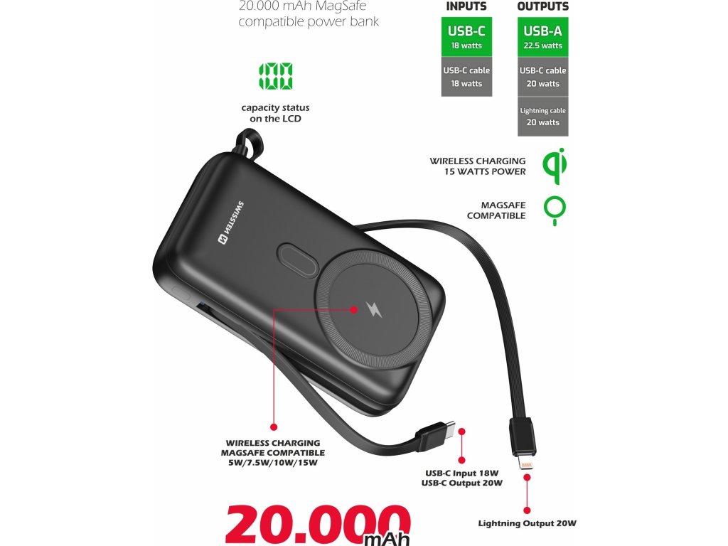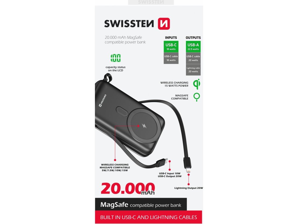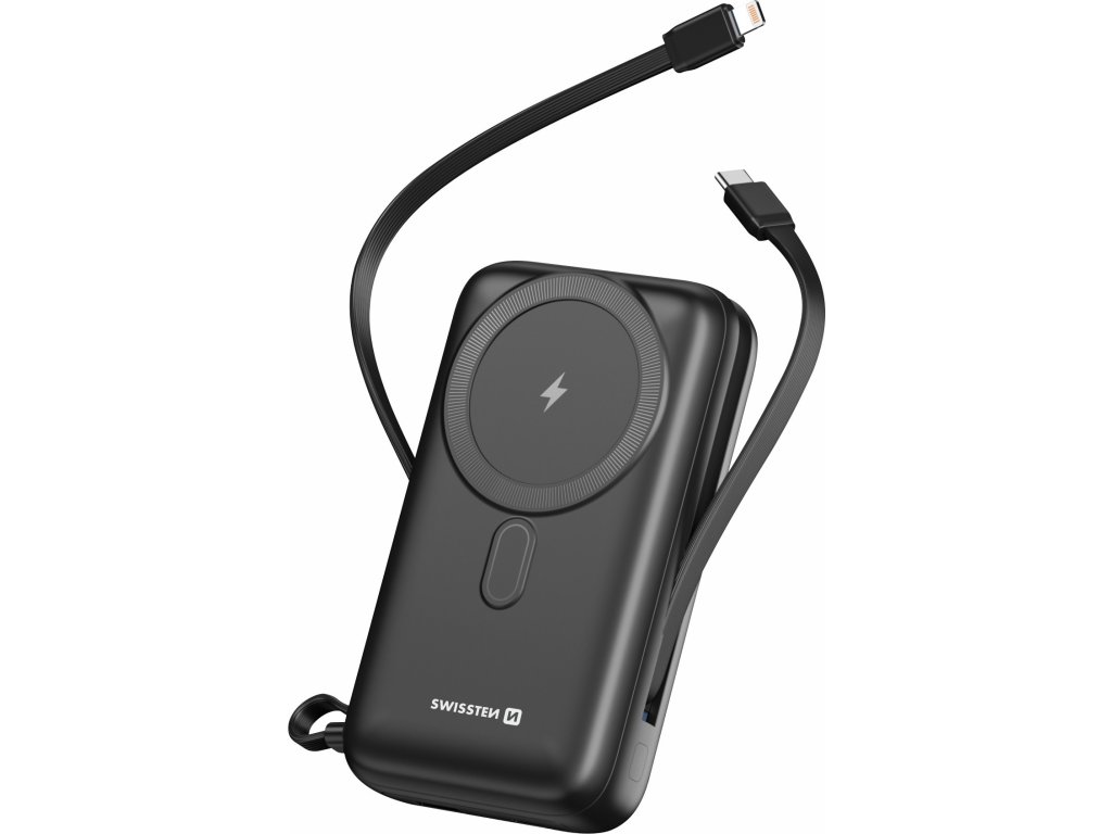 Hľadáte powerbanku, s ktorou už nebudete musieť riešiť žiadne káble, a zároveň bude mať dostatočnú kapacitu? Našli ste správne. Naša Swissten powerbanka, ktorá má ako bezdrôtové nabíjanie MagSafe, tak integrované káble na nabíjanie a splní všetky vaše očakávania. Powerbanka disponuje kapacitou 20.000 mAh, vďaka čomu nebudete musieť na svojich cestách riešiť, či sa Vaše zariadenie vydrží alebo nie.