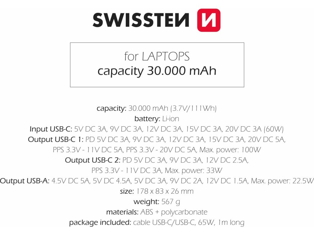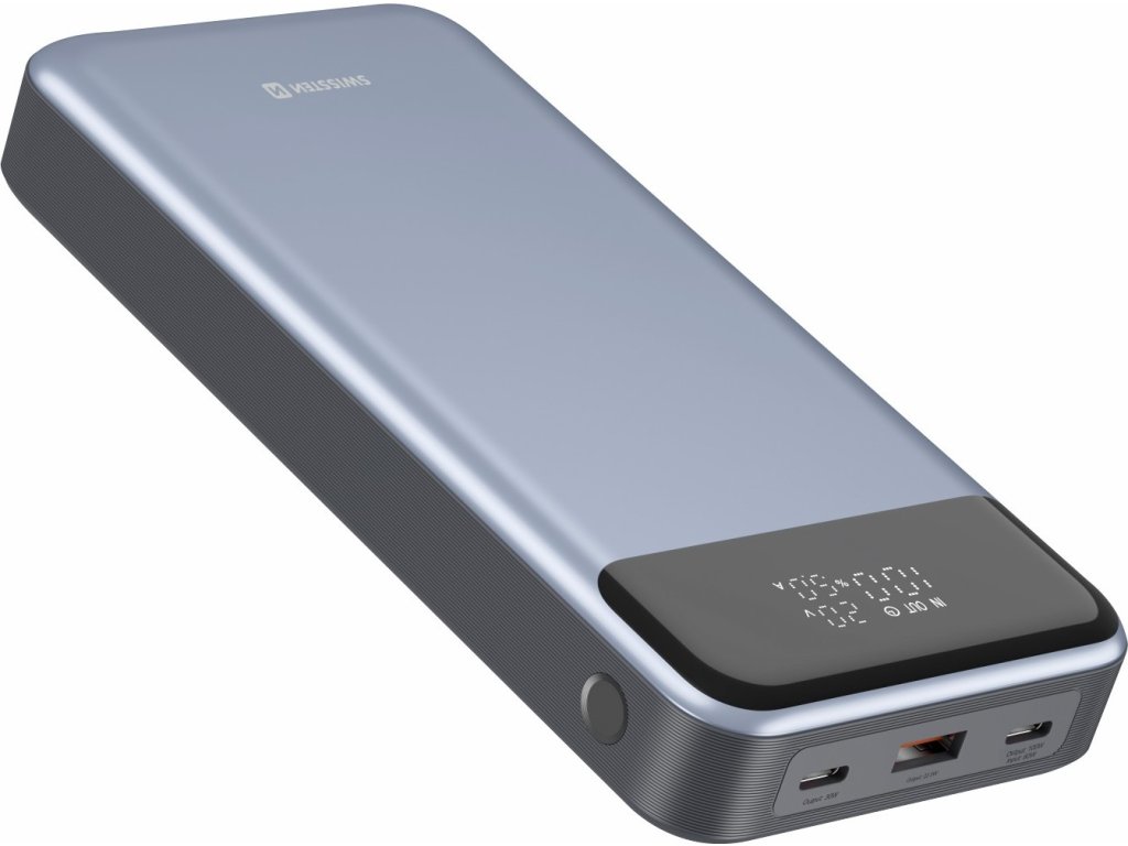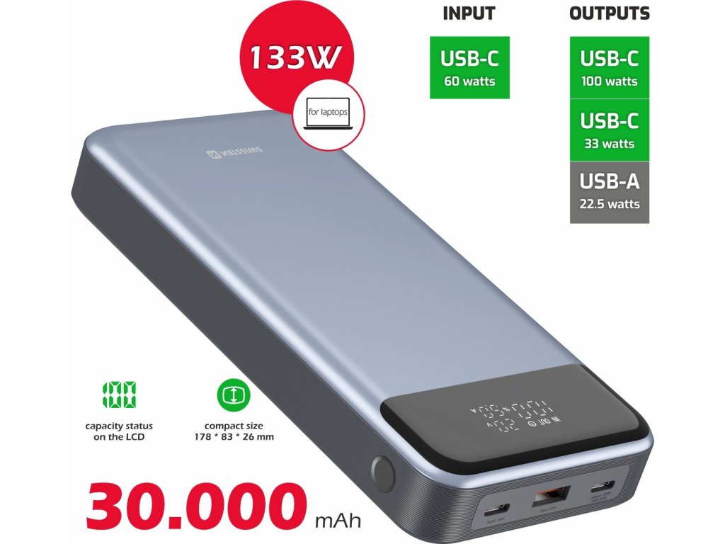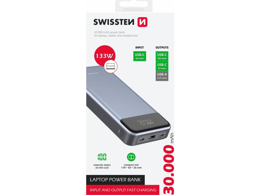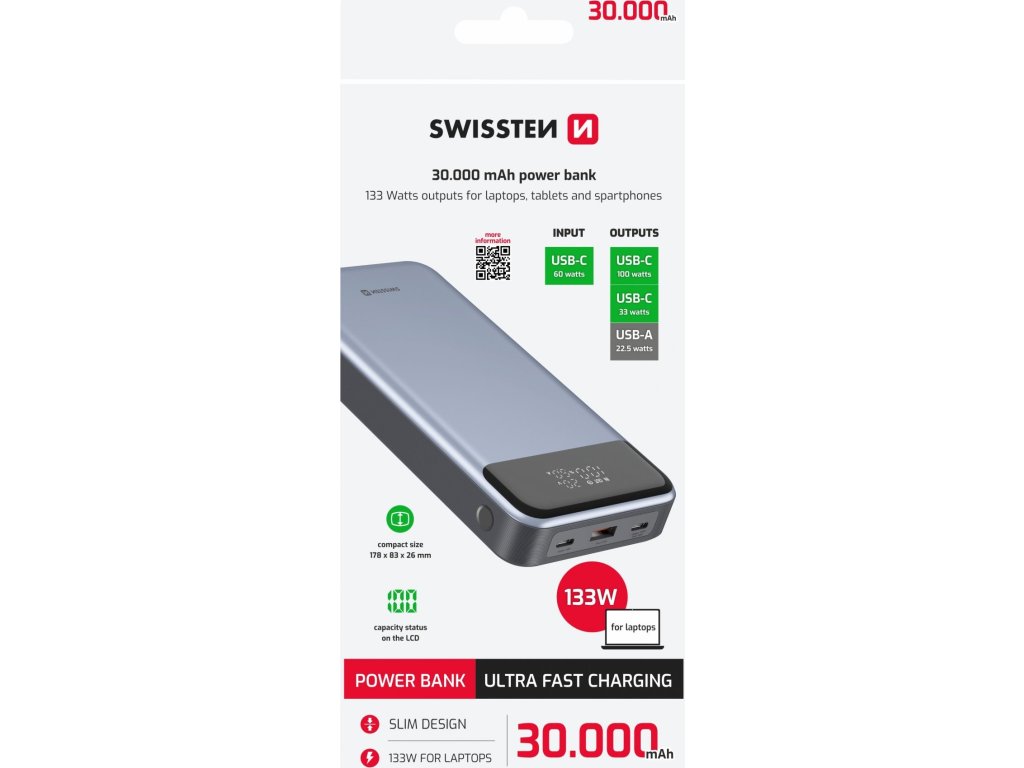 Power Banka SWISSTEN a kapacitou 30.000mAh, vstupom USB-C, výstupmi 2xUSB-C, 1xUSB-A a rýchlym dobíjaním PD a QC s výstupným výkonom až 133W. Balené v blistri SWISSTEN.
