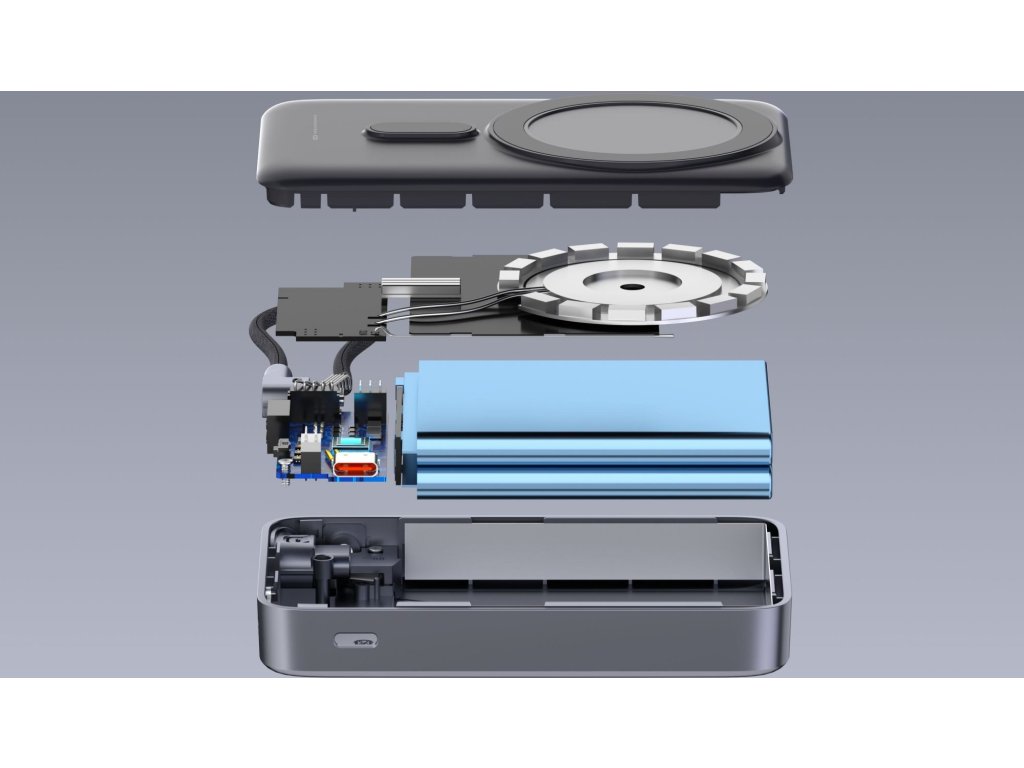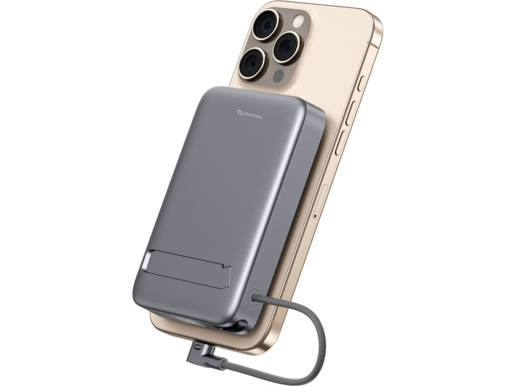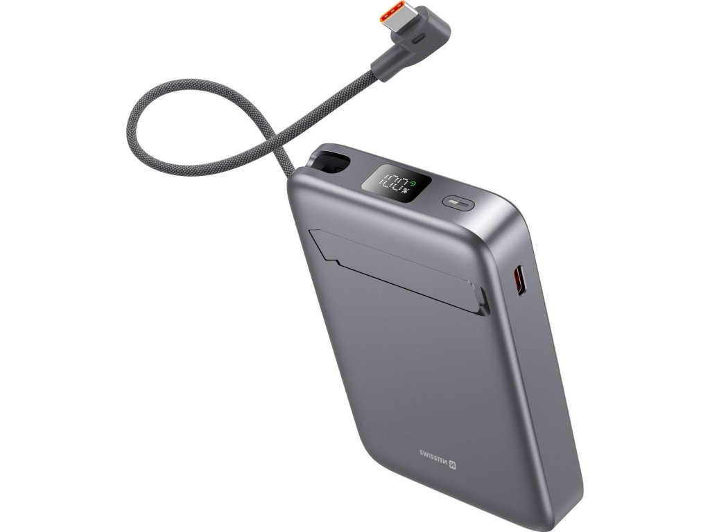 Súčasťou tela powerbanky je praktický 15cm USB-C kábel, ktorý je ihneď pripravený na použitie. Výklopný stojan zase umožní pohodlné sledovanie obrazovky počas nabíjania.
