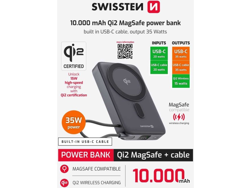 Kompaktná a výkonná MagSafe powerbanka SWISSTEN Qi2 prináša špičkové technológie na rýchle a pohodlné nabíjanie. Vďaka novému štandardu Qi2 a výstupnému výkonu až 35 W zvládne bez problémov napájať nielen chytré telefóny, ale aj náročnejšie zariadenia ako tablety či notebooky. Ideálne riešenie na cesty, do kancelárie aj každodenné použitie.