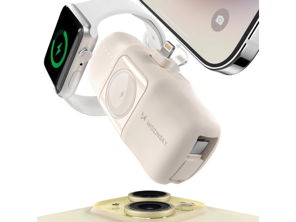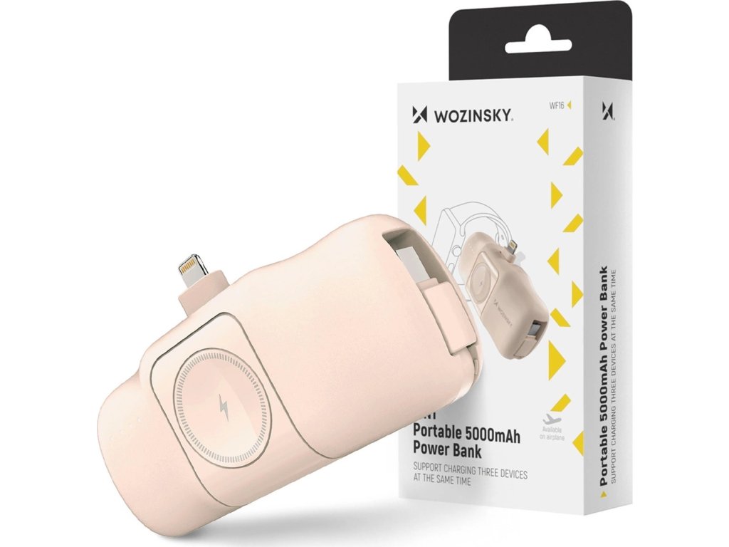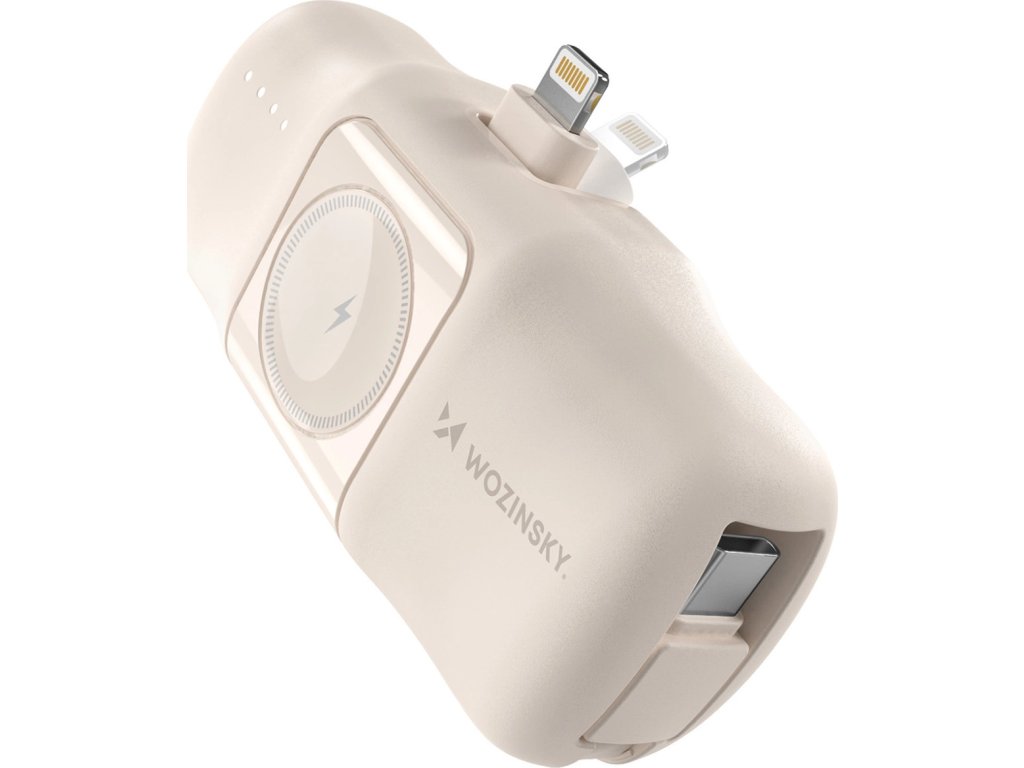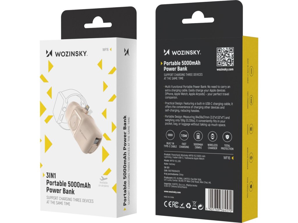 Wozinsky WF16-YLS 5000mAh 15W Lightning Mini Power Bank so vstavaným káblom USB-C a nabíjačkou pre Apple Watch - béžová