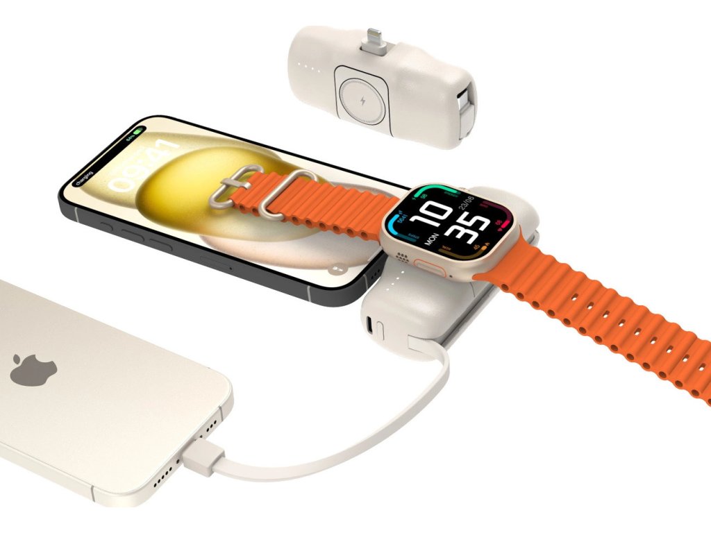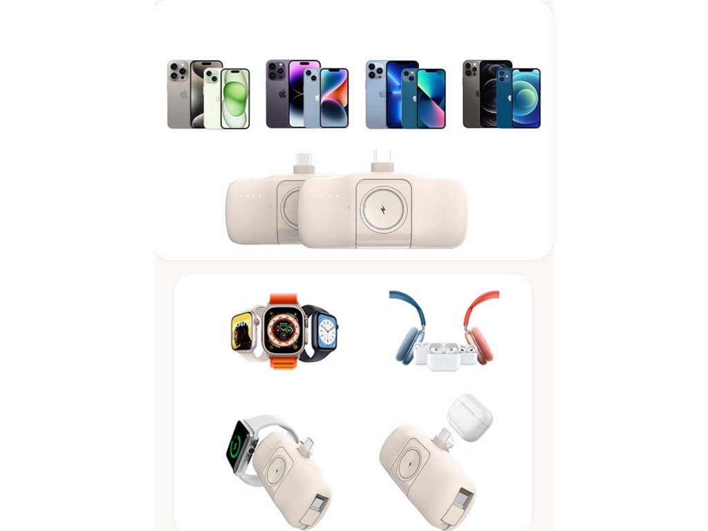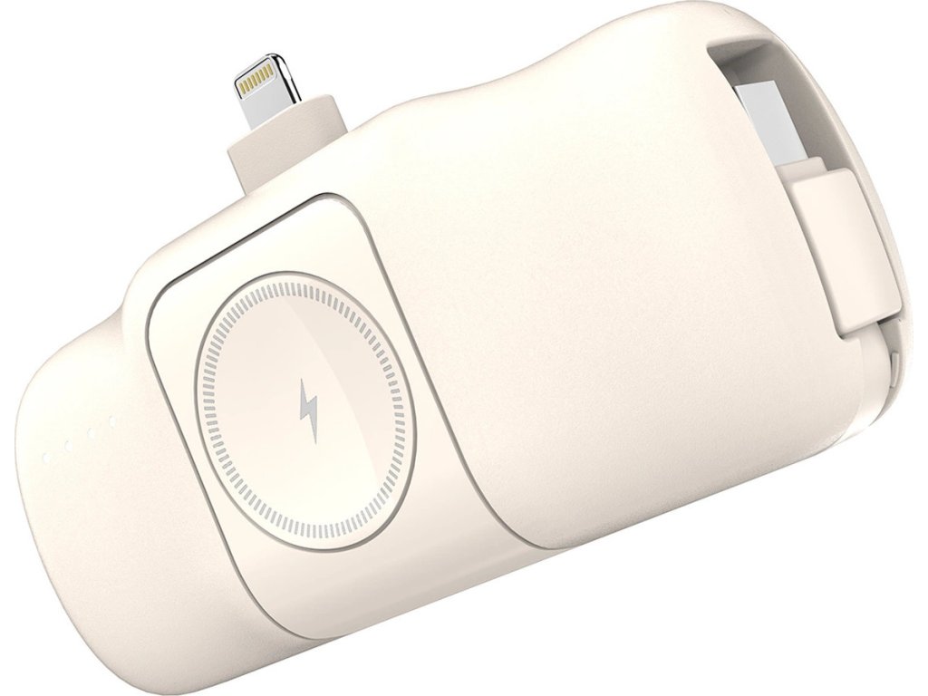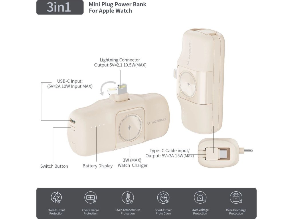Wozinsky WF16-YLS 5000mAh 15W Lightning Mini Power Bank so vstavaným káblom USB-C a nabíjačkou pre Apple Watch - béžová