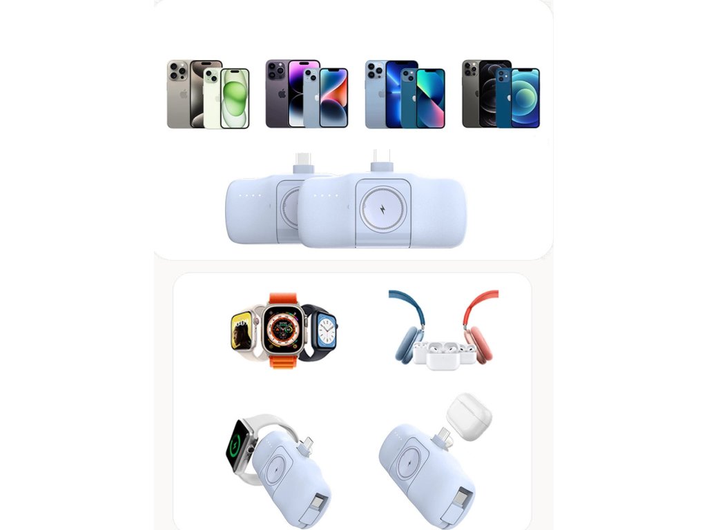 Wozinsky WF16-YLS 5000mAh 15W Lightning Mini Power Bank so vstavaným káblom USB-C a nabíjačkou pre Apple Watch - modrá