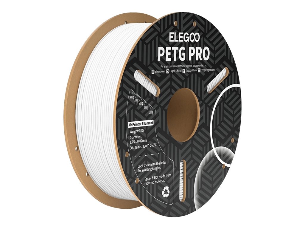 Filament ELEGOO PETG Pro je vynikajúcou voľbou pre tých, ktorí hľadajú materiál s vysokou mechanickou a tepelnou odolnosťou, ktorý sa zároveň ľahko tlačí. Poskytuje výnimočnú trvanlivosť, nízku náchylnosť na deformáciu a vynikajúcu priľnavosť k filmu, takže je ideálny pre technické komponenty, použiteľné prototypy a diely vystavené náročnému používaniu.