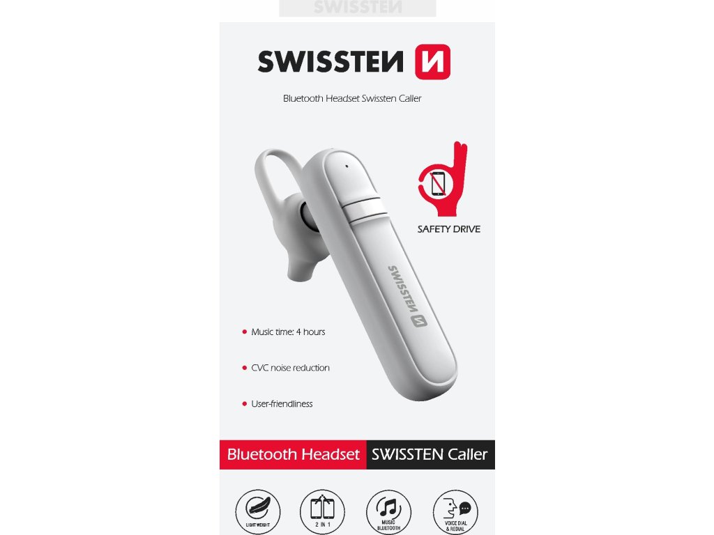 Ľahký bluetooth headset SWISSTEN CALLER, s príjemným ergonomickým designom na bezpečné telefonovanie. Balené v blistri SWISSTEN.