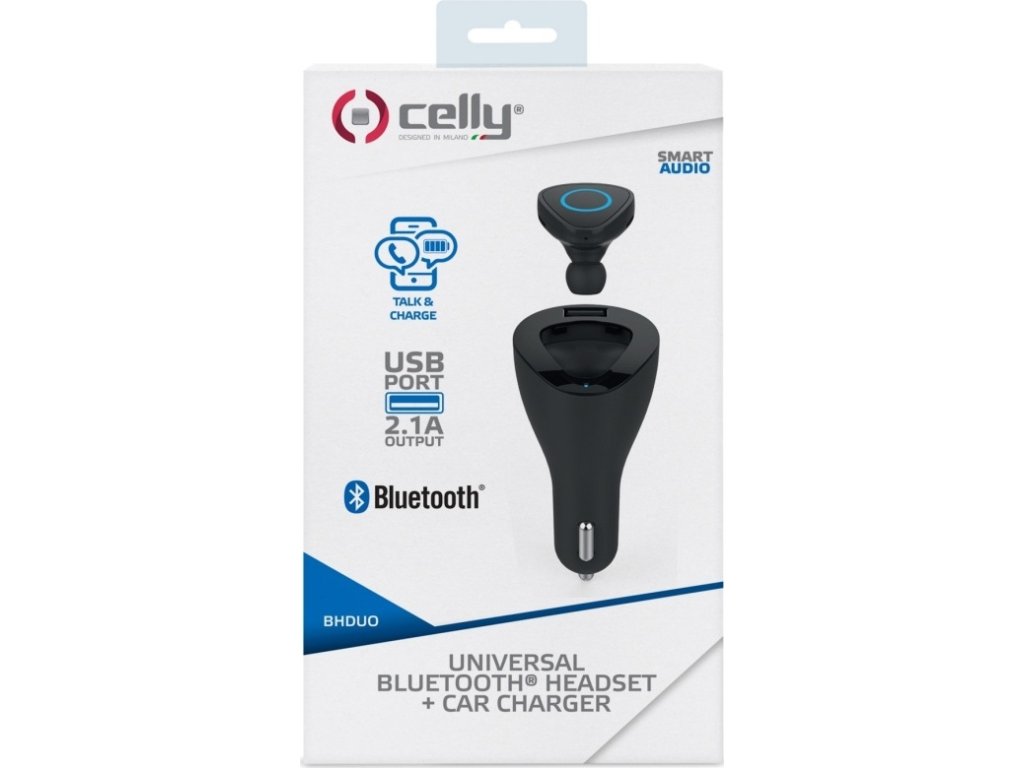 CELLY set 2v1 predstavuje praktickú kombináciu autonabíjačky a Bluetooth headsetu. Kompaktný headset je ukrytý priamo v nabíjačke a neustále pripravený na použitie, odpadnú tak starosti s jeho dobíjaním. Prichádzajúci hovor jednoducho prijmete vybratím headsetu, prípadne je možné prijatie/odmietnutie hovoru ovládať pomocou tlačidla priamo na headsete. Bluetooth technológia verzia 4.0 zaistí bezproblémové spojenie s väčšinou telefónov a pomocou funkcie multipoint môžete spárovať aj viac telefónov súčasne. Vďaka USB portu v nabíjačke môžete pripojiť akýkoľvek nabíjací kábel a doplniť energiu vo vašom smartfóne alebo tablete.
