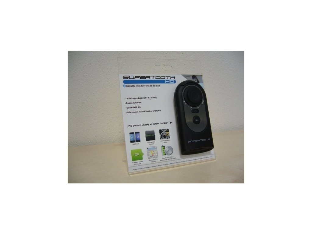 Bluetooth handsfree Supertooth HD s praktickým umiestnením na slnečnú clonu spája klasické prvky prenosného handsfree s vlastnosťami pevnej inštalačnej sady. Medzi prednosti sady patrí funkcia Multipoint, ktorá umožňuje súbežné pripojenie 2 telefónov zároveň bez obmedzenia. Dvojica mikrofónov a hlasných reproduktorov s výkonom 5,4 wattov class D zaistí bezproblémové vybavovanie hovorov pri jazde v maximálnej kvalite. SuperTooth HD ďalej ponúka A2DP profil na počúvanie hudby a GPS inštrukcií z mobilného telefónu, plne duplexný režim a samozrejme funkciu DSP pre redukciu šumu a okolitého ruchu. Na clonu sa upevňuje pomocou pevnej spony, ktorá zaistí bezpečné a praktické upevnenie handsfree na clone, ovládanie sady je intuitívne a jednoduché prostredníctvom veľkého otočného ovládača. Vysoká výdrž na jedno nabitie či bežný miniUSB konektor je iba čerešnička na torte. Balené v predajnom blistri Supertooth vhodnom na zavesenie na stojan.