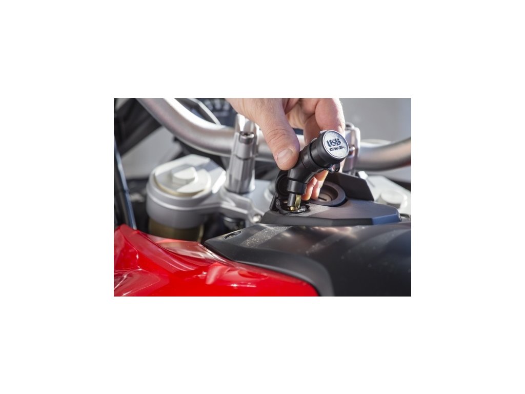12 V adaptér z DIN na 2x USB konektor. Umožňuje nabíjanie dvoch elektronických zariadení pomocou USB nabíjacieho kábla. Je praktický, kompaktný, vybavený ochranným krytom proti vniknutiu vody.