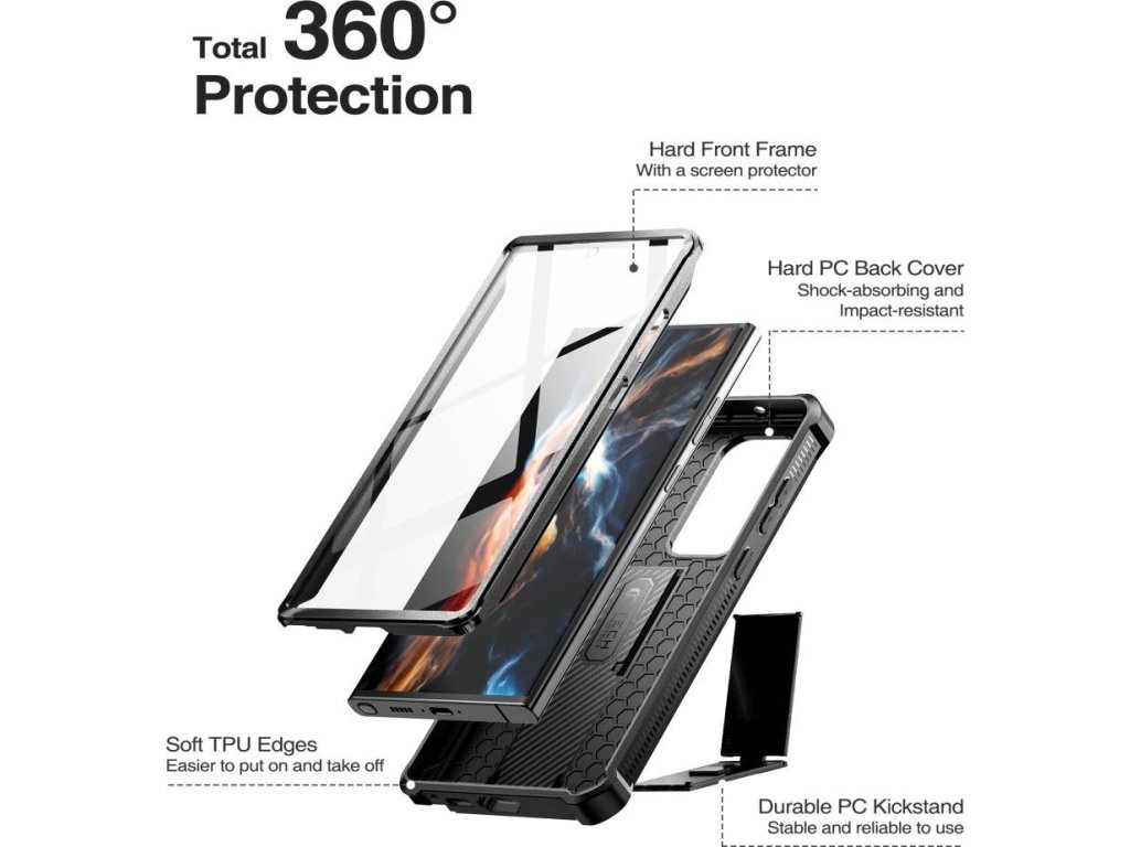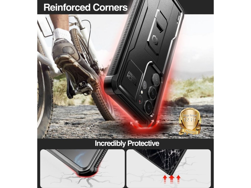 Dvojdielne puzdro kombinuje pevný zadný pancier vyrobený z PC škrupiny a nárazuvzdorného TPU. Dodatočná výstuha v rohoch - ochranné airbagy - účinne absorbujú každý pád. Predná strana zariadenia je krytá rámom s integrovaným polykarbonátovým krytom. Toto riešenie dokonale oddeľuje displej a chráni ho pred poškriabaním.