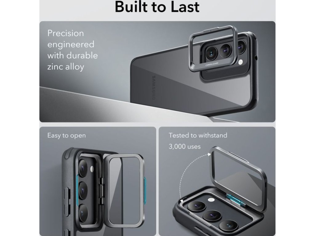 Okrem štandardnej, zvýšenej krytky okolo šošoviek je puzdro navyše vybavené kovovým otvárateľným rámčekom, ktorý je možné ľahko premeniť na funkčný stojan. Má kryty tlačidiel a výrezy pre porty.