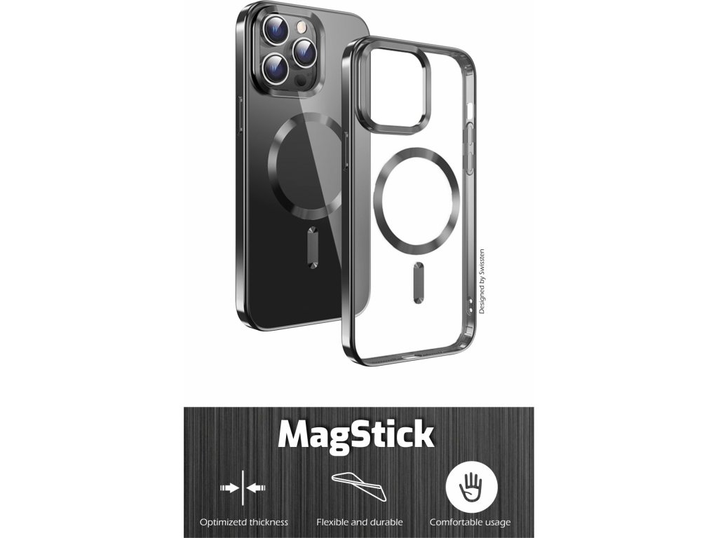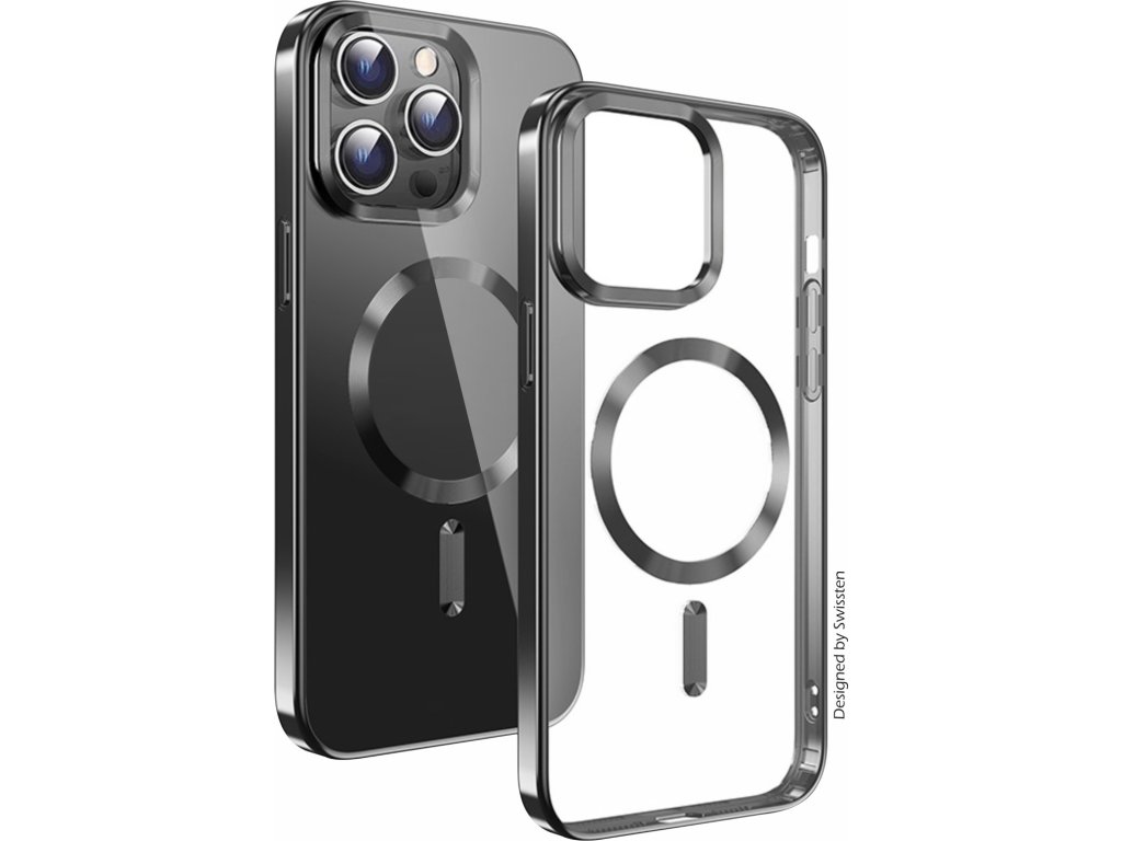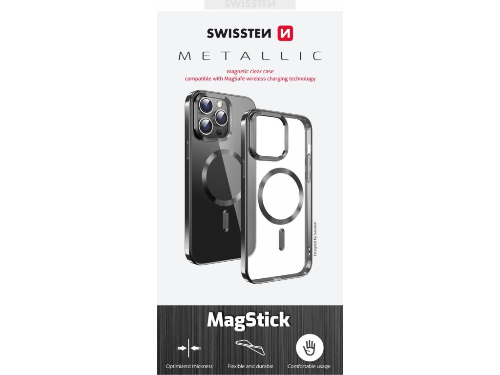 Luxusné číre puzdro SWISSTEN MagStick Metallic s elegantným čiernym rámčekom a metalickými doplnkami. Vhodné na dobíjanie MagSafe. Balené v blistri SWISSTEN MagSafe Bezdrôtové nabíjanie s puzdrom MagStick je veľmi jednoduché. Dokonale rozmiestnené magnety na nabíjačke vycentrujú puzdro s dobíjacou plochou nabíjačky s MagSafe. Spracovanie Puzdro je vyrobené z číreho silikónu v kombinácii s čiernymi silikónovými hranami. Atraktívny dizajn dodávajú púzdru metalické doplnky na zadnej časti puzdra. RRP: 12,90 € s DPH