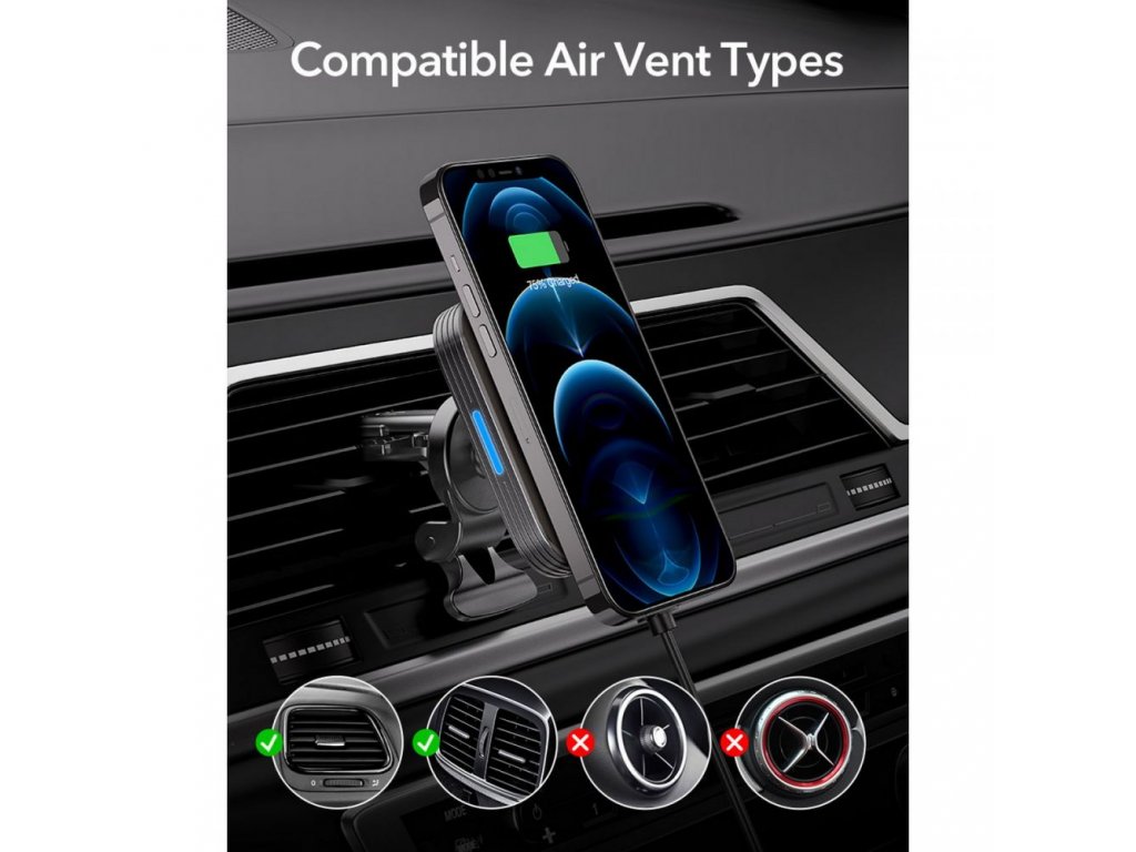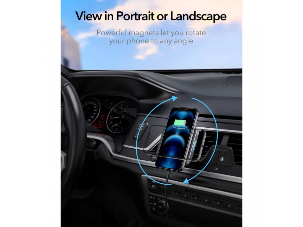 Otočná hlava o 360 stupňů umožňuje úplné otáčení zařízení, což zajišťuje vysoký komfort používání a dokonalé uchycení v jakémkoli úhlu. O stabilitu se postará dolní rameno, které se opírá o větrání, takže váš telefon zůstane stále bezpečně na jednom místě. O napájení pro bezdrátové nabíjení se stará USB-C kabel, který je přiložený v balení a je nutné jej zapojit do adaptéru s USB v zapalování nebo případne do zabudovaného USB konektoru v novějších vozech.
