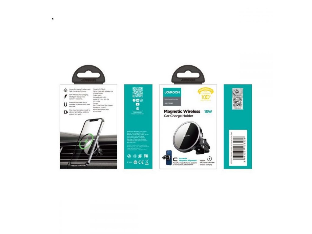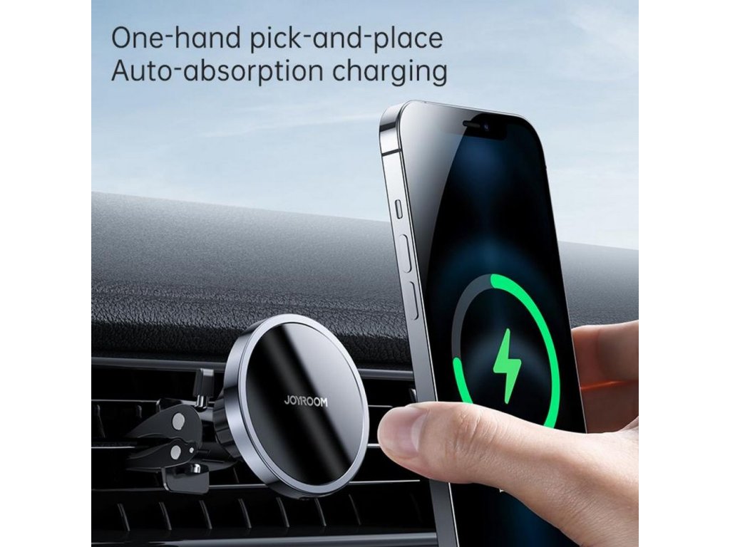 Inovatívna magnetická nabíjačka Joyroom JR-ZS240 je kombináciou pohodlnej, magnetickej montáže a bezdrôtového nabíjania s MagSafe technológmií. JR-ZS240 je dokonale vyrobený držiak do auta pripevnený k ventilačnej mriežke určený pre zariadenia Apple s bezdrôtovou funkciou MagSafe. 360-stupňová otočná hlava umožňuje plné otáčanie zariadenia, čo zaisťuje vysoký komfort používania a dokonalé uchytenie v akomkoľvek uhle. Držiak disponuje aj funkciou rýchleho bezdrôtového Qi nabíjania 15W s MagSafe technológiou.