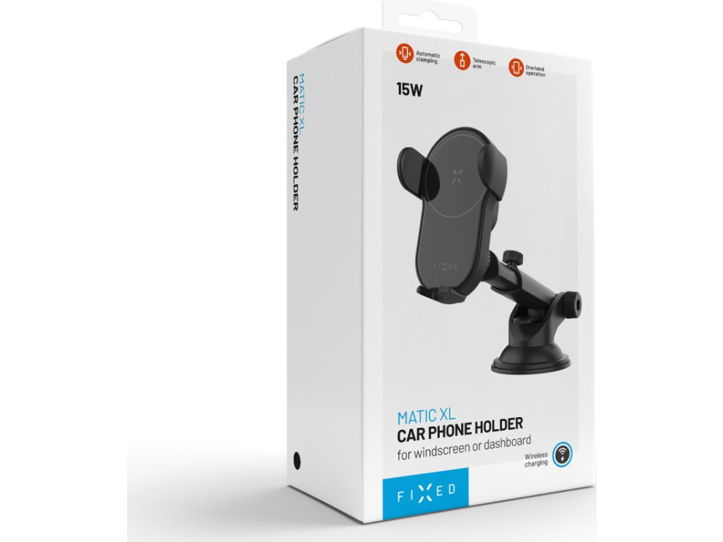 FIXED Matic XL predstavuje moderný držiak mobilného telefónu s rýchlym bezdrôtovým nabíjaním, automatickým zovretím klieští a výsuvným predĺženým ramenom. Je určený na uchytenie na palubnú dosku alebo čelné sklo pomocou prísavného podstavca. Po vložení telefónu sa okamžite spustí rýchle bezdrôtové nabíjanie s výkonom 15W s podporou Qualcomm Quick Charge 3.0. Rameno držiaka s nastaviteľnou dĺžkou je vhodné aj do dodávok a nákladných vozidiel. Pomocou otočného kĺbu si nastavíte telefón do ideálneho uhla tak, aby bol v prípade potreby pekne na očiach. S držiakom FIXED Matic bude vaša jazda s telefónom v aute pohodlnejšia a bezpečnejšia ako kedykoľvek predtým.