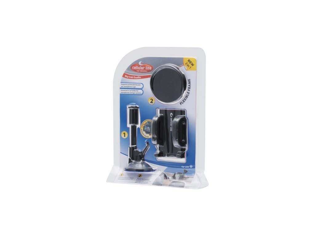 Big Crab Dualfix je nastaviteľný, univerzálny držiak určený na uchytenie prenosných zariadení do auta, ako sú mobilné telefóny alebo GPS navigácia. Nezávislé rotačné pätky sú jednoducho usporiadané tak, aby držali zariadenie bez toho, aby narušovali jeho pripojenie. Rotačná hlava tohto držiaka umožňuje nastaviť si vaše zariadenie horizontálne aj vertikálne. Polstrované zvieracie plochy zaručujú úplnú stabilitu bez škrabance alebo akejkoľvek stopy na vašom zariadení. Big Crab Dualfix jednoducho namontujete na čelné sklo vášho automobilu pomocou prísavného zariadenia s "easy lift" páčkou. Jeho flexibilné rameno, dlhé 96 mm, znižuje vibrácie počas jazdy na minimum. Big Crab Dualfix je možné umiestniť aj priamo na palubnú dosku pomocou flexibilnej prísavky s extra silnou páskou 3M™, ktorá zaisťuje maximálnu priľnavosť, a to aj na zakrivené povrchy.