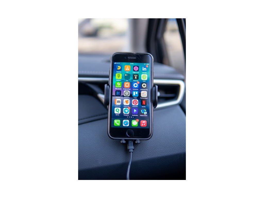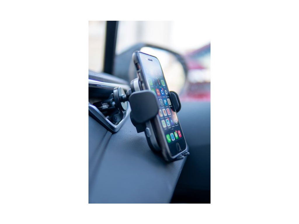 Držiak sa prichytí pevným zobáčikom do vetracej mriežky a navyše sa upevní stabilizátorom. Tým sa zvýši upevnenie smartfónu a cestovanie je bezpečnejšie.
