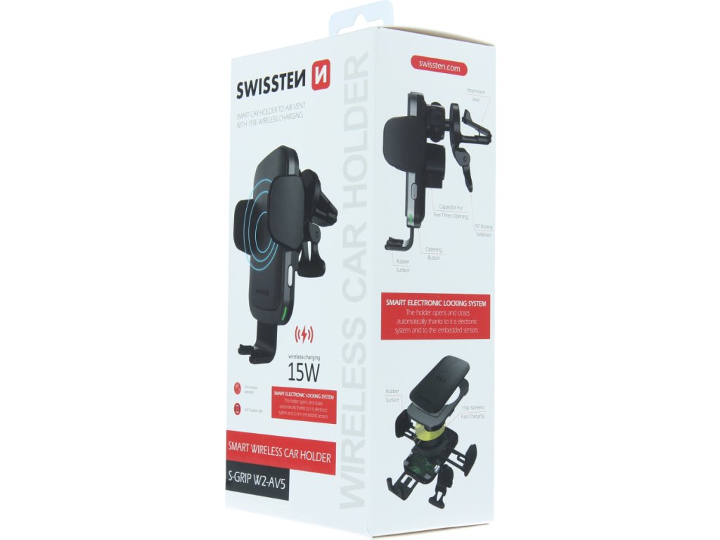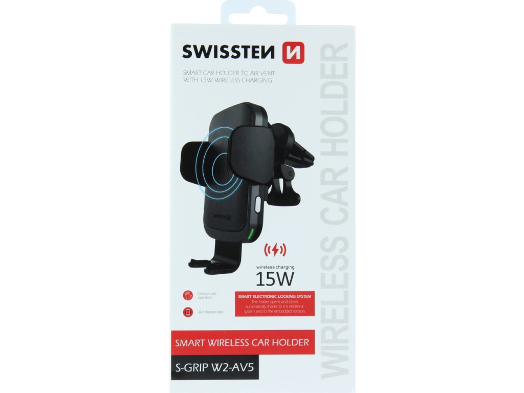 Držiak do auta s bezdrôtovým nabíjaním SWISSTEN S-GRIP W2-AV5 je určený na umiestnenie do vetracej mriežky. Držiak disponuje rýchlym nabíjaním s výkonom 15W. Balené v blistri Swissten.