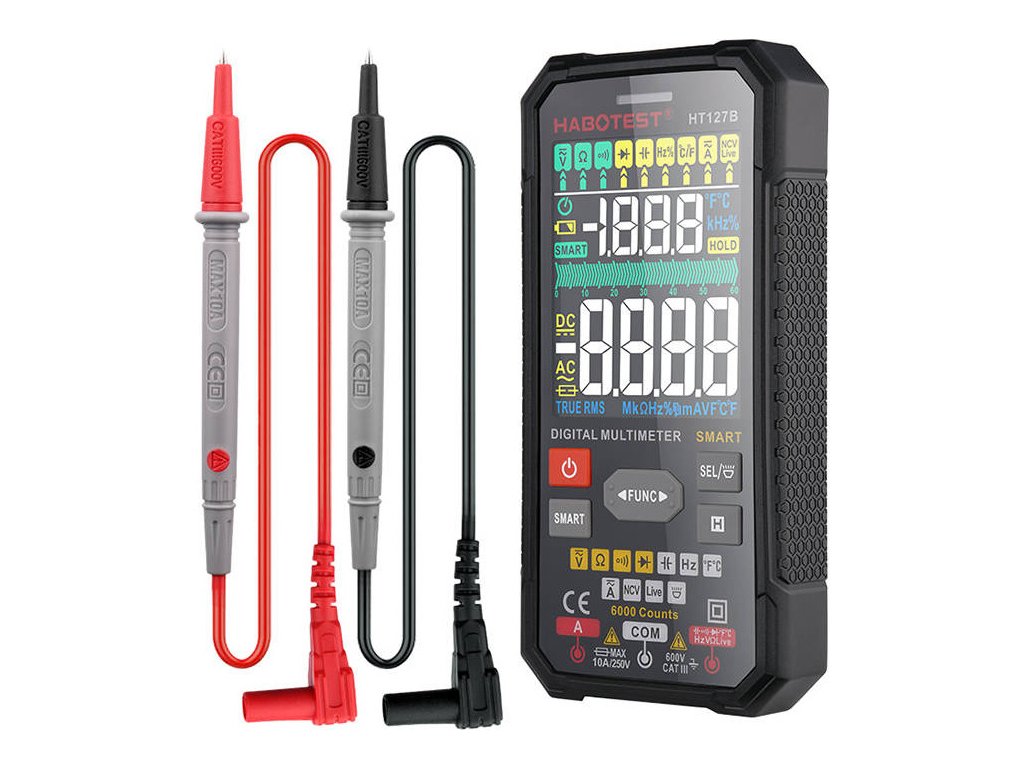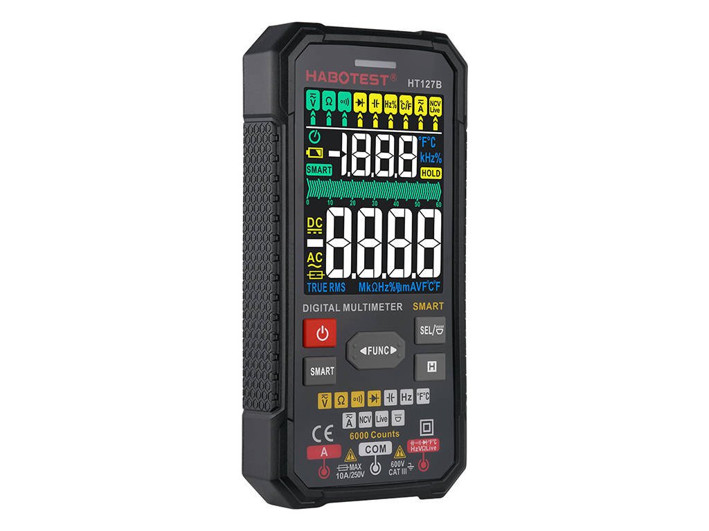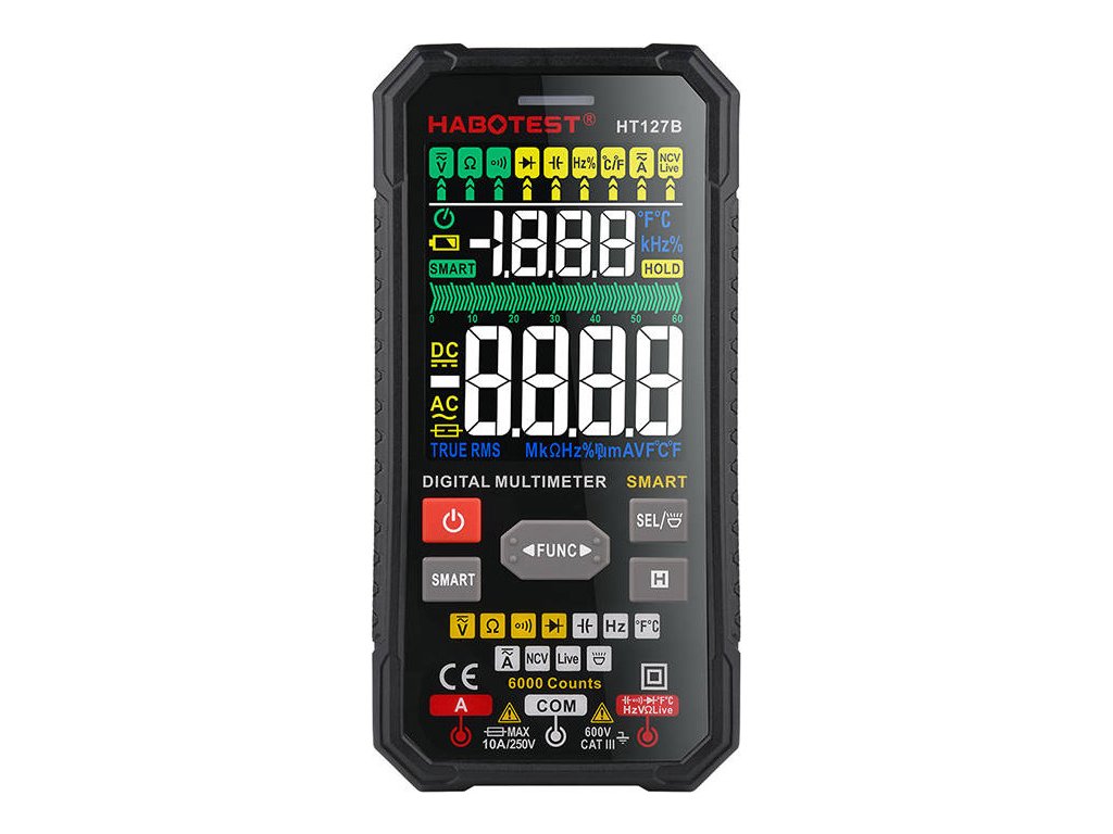 Digitálny univerzálny multimeter Habotest HT127B je šikovný prístroj, ktorý prekvapí rozsiahlosťou svojich možností. Umožňuje okrem iného merať s vysokou presnosťou striedavé a jednosmerné napätie a prúd, odpor, teplotu alebo kapacitu. Okrem toho ponúka funkciu Live Test, umožňuje testovanie diód, bezkontaktnú detekciu napätia (NCV) a mnoho ďalšieho. Dôležité je, že multimeter disponuje praktickými tlačidlami, pomocou ktorých môžete efektívne zvoliť funkciu.