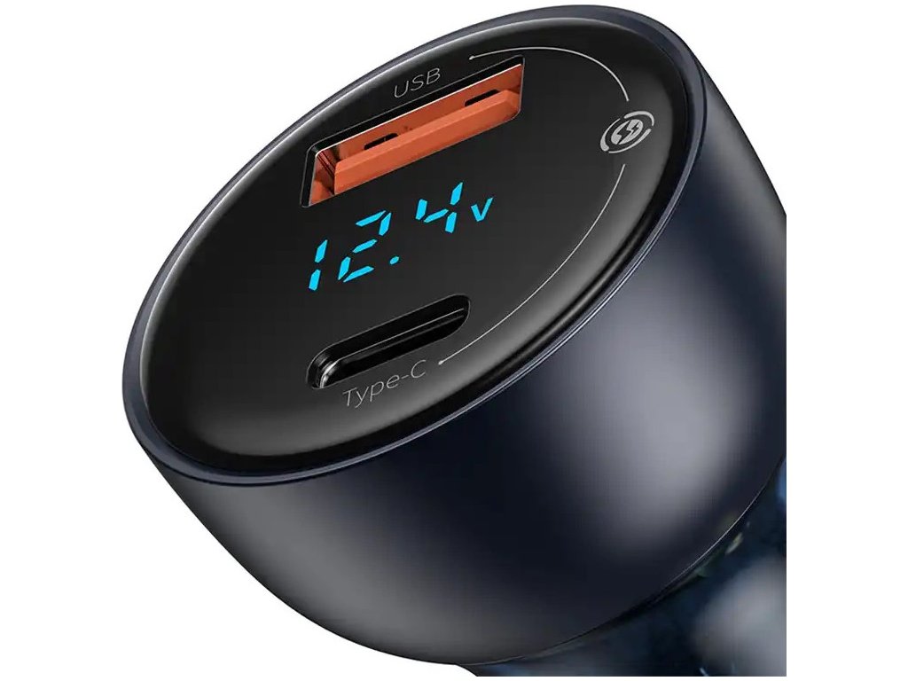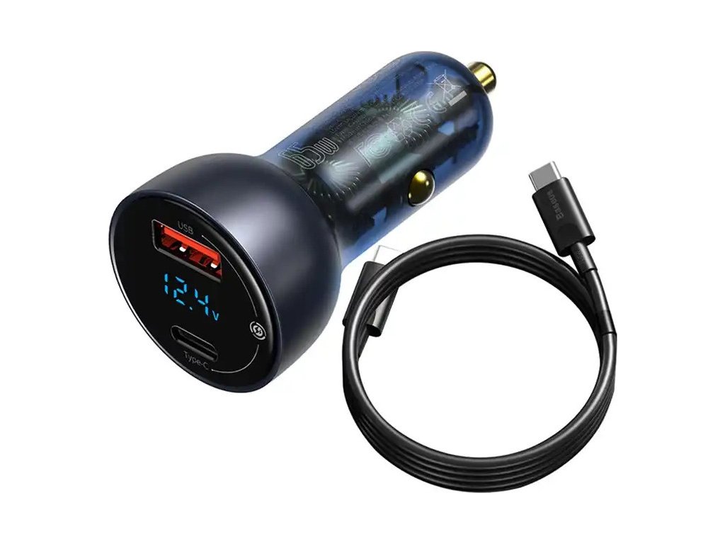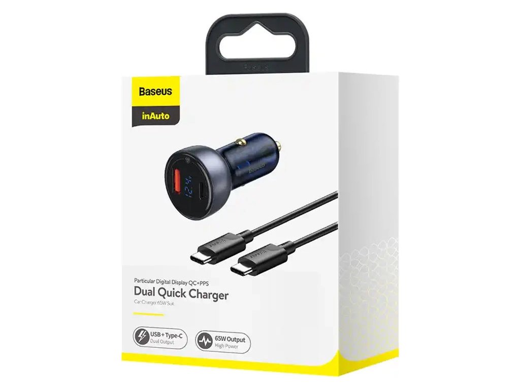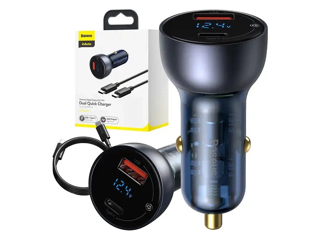 Baseus Particular Digital Display nabíjačka do auta s displejom, USB + USB-C, QC3.0 + PD, 5A, 65W (sivá) + kábel USB-C 1m 100W (čierna).