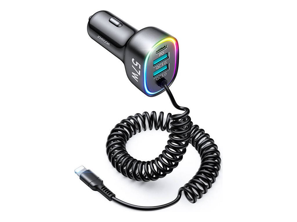 Nabíjačka do auta Joyroom je nevyhnutným príslušenstvom každého auta! Má maximálny výkon 57 W a podporuje rýchle nabíjanie PD, QC, AFC a FCP. Má vstavaný kábel Lightning a 3 porty USB (1x USB-C, 2x USB), ktoré umožňujú nabíjať 4 zariadenia súčasne. Vyznačuje sa širokou kompatibilitou a hodí sa do väčšiny vozidiel so zásuvkou zapaľovača cigariet. Farebné podsvietenie navyše uľahčí pripojenie zariadenia k nabíjačke v tme.