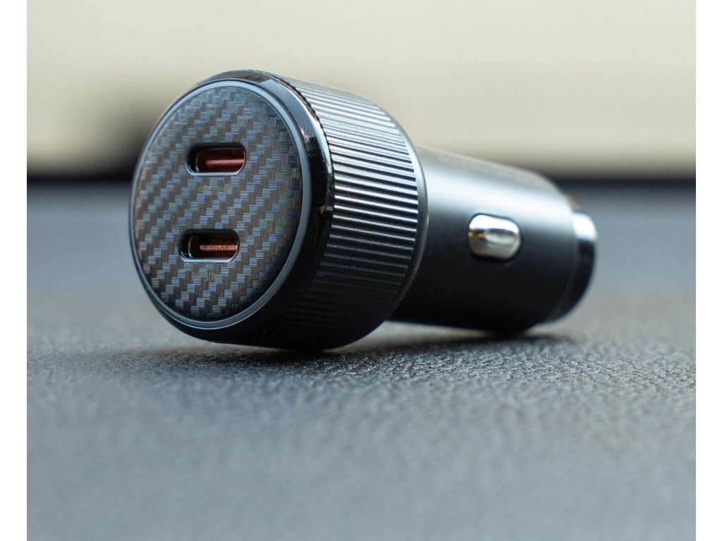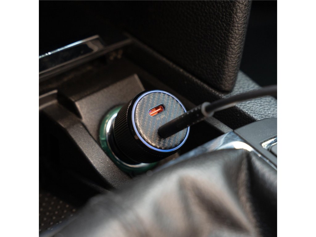 Praktická autonabíjačka s dvojicou USB-C portov a podporou PD 3.0, dodávaná s prémiovým USB-C/USB-C káblom (1 m, 60W, 3A, soft silicone). Modré LED podsvietenie uľahčuje pripojenie aj v tme.