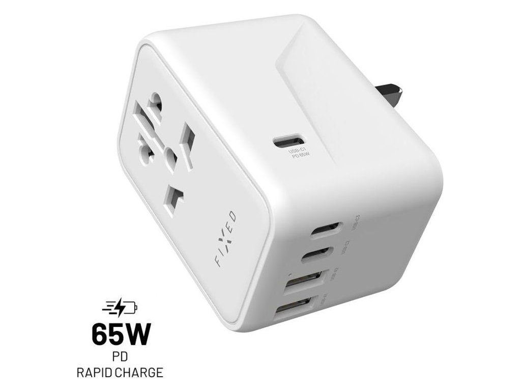 Cestovný adaptér FIXED pre EÚ, UK a USA/AUS, s 3xUSB-C a 2xUSB výstupom, GaN, PD 65W, biely