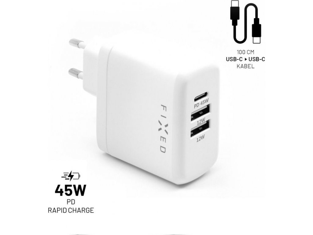 Set sieťovej nabíjačky FIXED s USB-C a 2xUSB výstupom a USB-C/USB-C kábla, podpora PD, 45W, biely