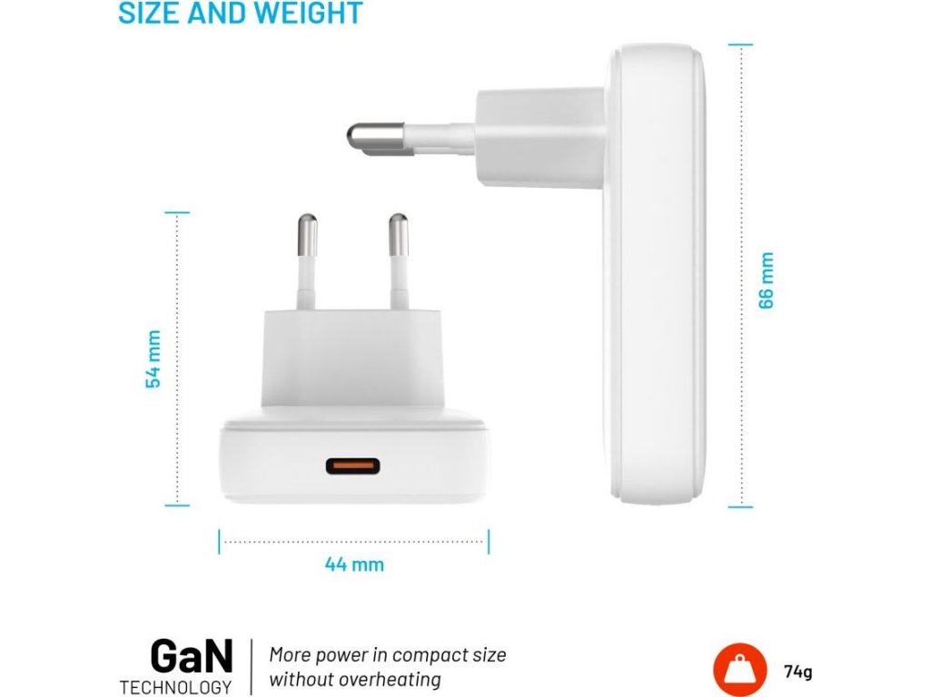 Nabíjačka má výstupný port USB-C s technológiou Powerdelivery pre Apple aj Super fast charging pre Samsung, vidličkou pre UK zásuvky a výstupný výkon 25W.