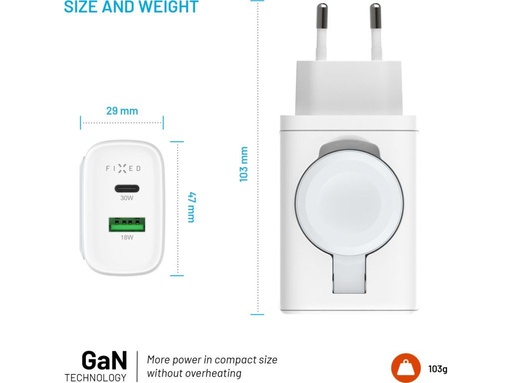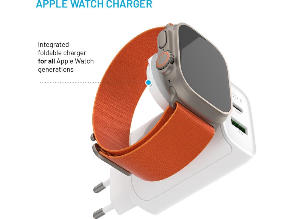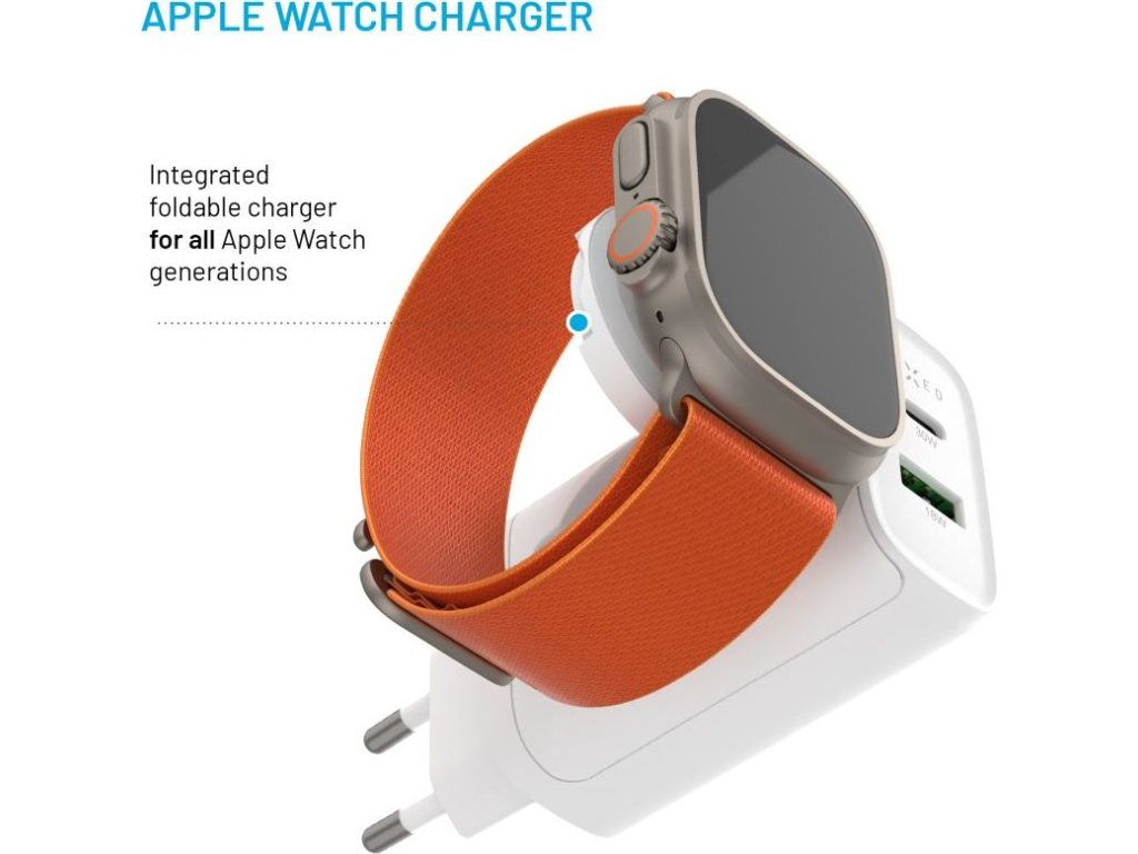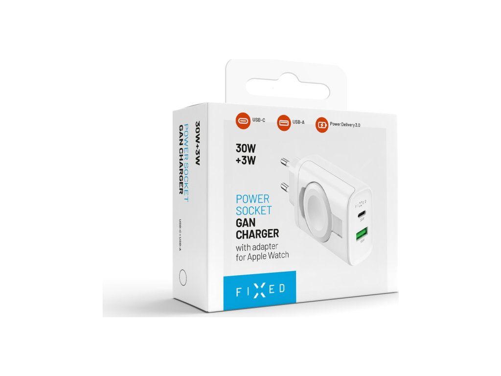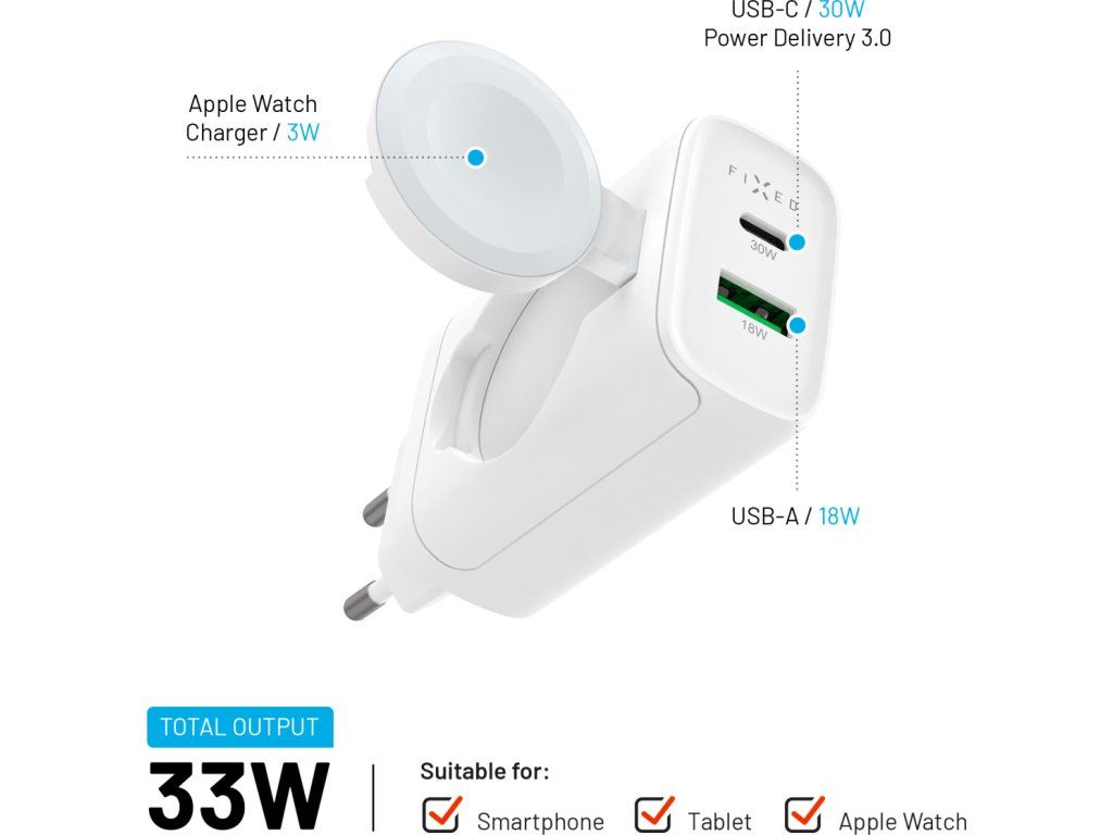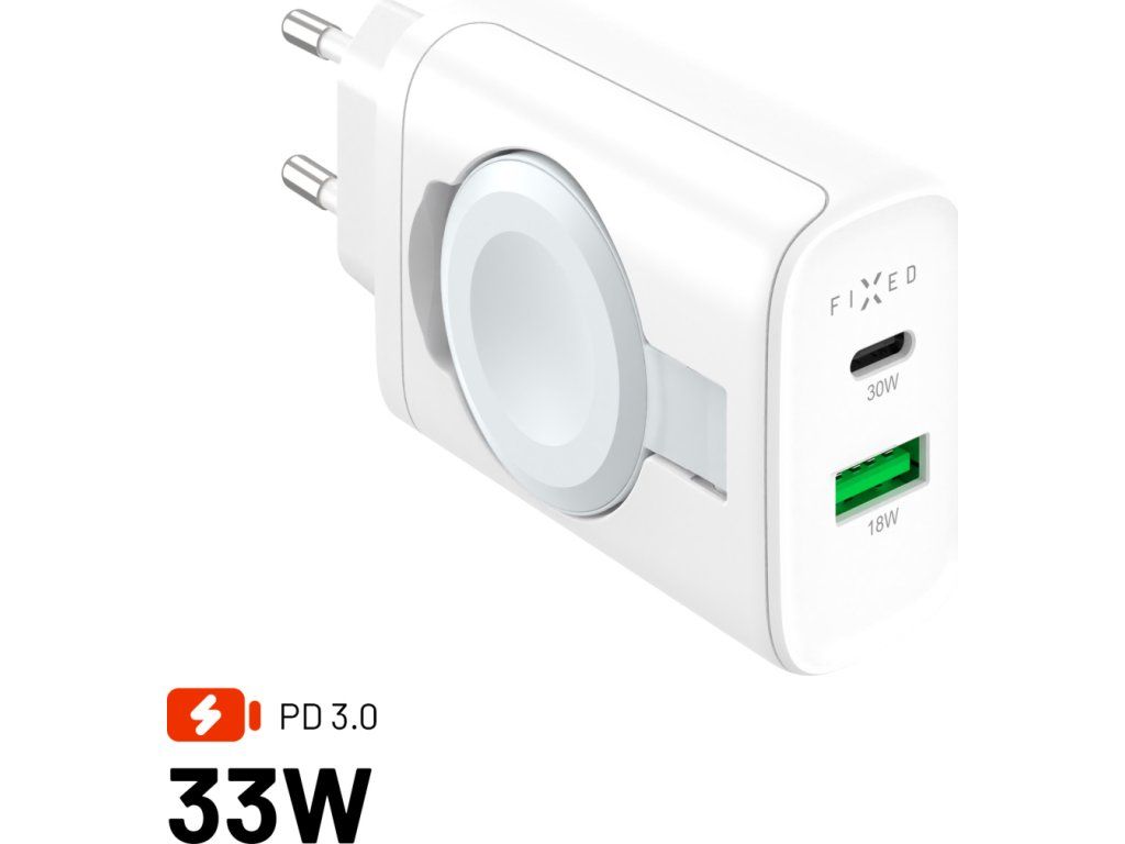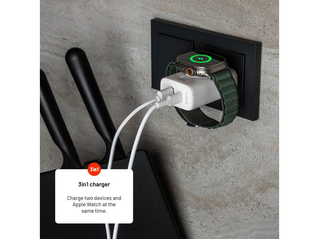 Kompaktná sieťová nabíjačka FIXED s výkonom až 33 W je praktickou kombináciou nabíjacích portov a integrovanej nabíjačky pre hodinky Apple Watch. S portami USB-C a USB-A ľahko a rýchlo dobijete váš telefón, tablet alebo inú elektroniku. Vďaka dvom portom je možné nabíjať dve zariadenia zároveň. Na pohodlné nabíjanie hodiniek Apple Watch je adaptér vybavený vyklápacou plochou s magnetickým konektorom pre presné vycentrovanie hodiniek a ich rýchle nabíjanie bez potreby ďalších káblov. Nabíjačka využíva technológiu GaN, ktorá zaisťuje vyšší výkon a efektivitu nabíjania pri zachovaní kompaktných rozmerov. Minimalistické a tenké telo nabíjačky nezaberá žiadne miesto, ľahko sa zmestí do každej tašky a je tak ideálnou voľbou pre rýchle nabíjanie, či už ste doma alebo na cestách.