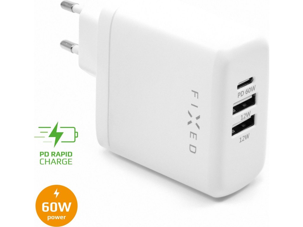 Sieťová nabíjačka FIXED sa postará o rýchle a bezpečné nabíjanie vášho moderného notebooku, tabletu, smartfónu a ďalšej elektroniky. USB-C port s podporou Power Delivery a výkonom až 60W je určený primárne na nabíjanie notebooku, zvládne nabíjať všetky Apple Macbook aj moderné notebooky iných výrobcov. Vedľa USB-C má nabíjačka FIXED aj dva klasické USB porty s rýchlym nabíjaním Rapid Charge (max. 12W) a umožní tak nabíjať až tri zariadenia súčasne. Pri zapojení všetkých troch portov súčasne nabíja adaptér výkonom 45W (USB-C) a 12W (dvojica USB portov), čo je dostatočné pre nabíjanie 13" MacBooku (Air i Pro) a telefónu alebo inej elektroniky zároveň. Adaptér sám rozpozná pripojené zariadenie a podľa toho mu dodá príslušný výkon podľa jeho potrieb.Nabíjanie je tak maximálne bezpečné a nehrozí žiadne prehrievanie ani prepätie.S nabíjacím adaptérom FIXED nemusíte mať strach, že vám dôjde energia vo vašom zariadení, či už ste doma, v kancelárii alebo na cestách.