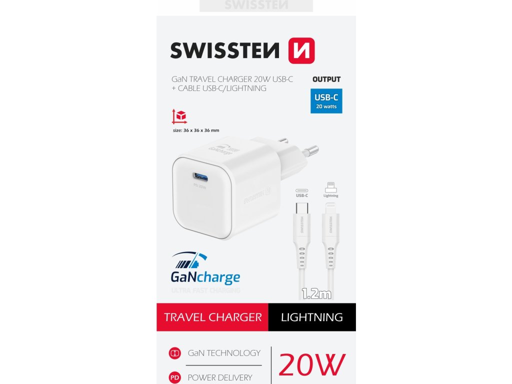 SWISSTEN SIEŤOVÝ ADAPTÉR GaN 1x USB-C 20W POWER DELIVERY BIELÝ + DÁTOVÝ KÁBEL USB-C/LIGHTNING 1,2 M BIELÝ