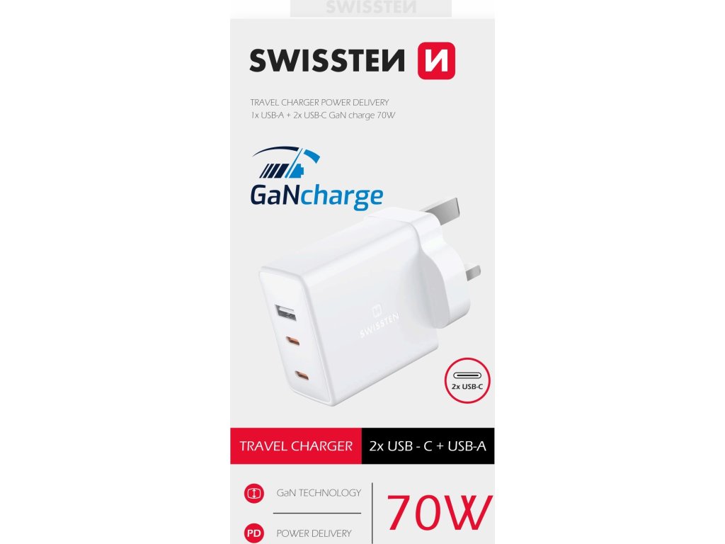 Nabíjačka z nového radu nabíjačiek SWISSTEN s revolučnou technológiou GaN. Nabíjačka je vybavená vidličkou pre UK zásuvky, dvoma výstupmi USB-C s technológiou rýchleho nabíjania Power Delivery a jedným výstupom USB 5W s celkovým výkonom 70W. Balené v blistri SWISSTEN