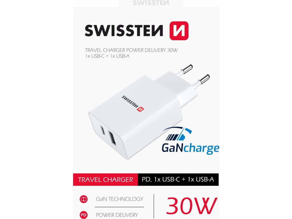 Nabíjačka z nového radu nabíjačiek SWISSTEN s revolučnou technológiou GaN. Výstupným portom USB-C a USB-A je vybavený technológiou rýchleho nabíjania Power Delivery a Qualcomm s celkovým výkonom 30W. Balené v blistri SWISSTEN