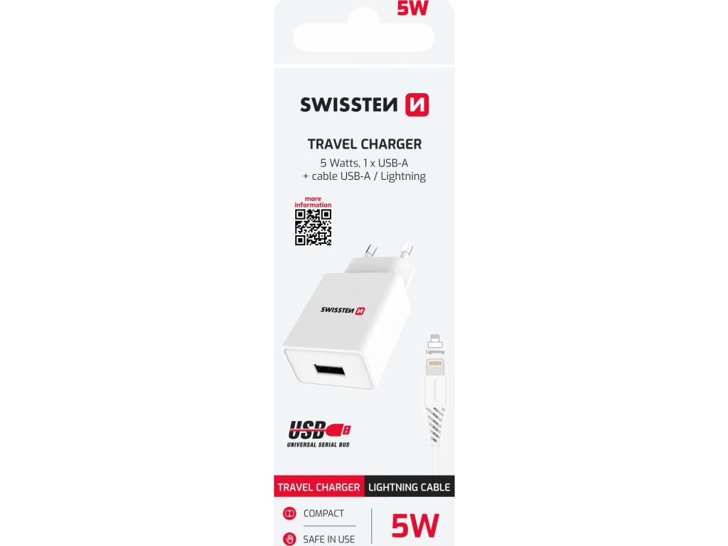 Kvalitná nabíjačka SWISSTEN s výstupným prúdom 1A. Nabíjačka má výstup 1xUSB a kábel USB/lightning 1,2m. Balené v blistri SWISSTEN