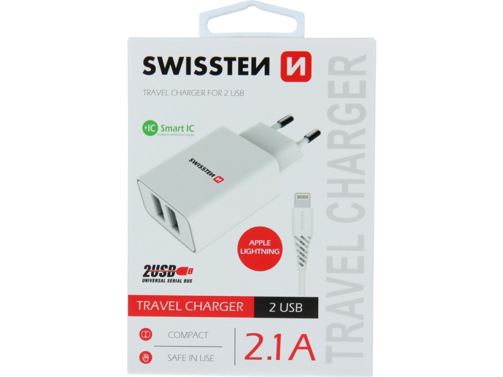 SWISSTEN SIEŤOVÝ ADAPTÉR SMART IC 2x USB 2,1 A POWER + DÁTOVÝ KÁBEL USB / LIGHTNING 1,2 M BIELÝ