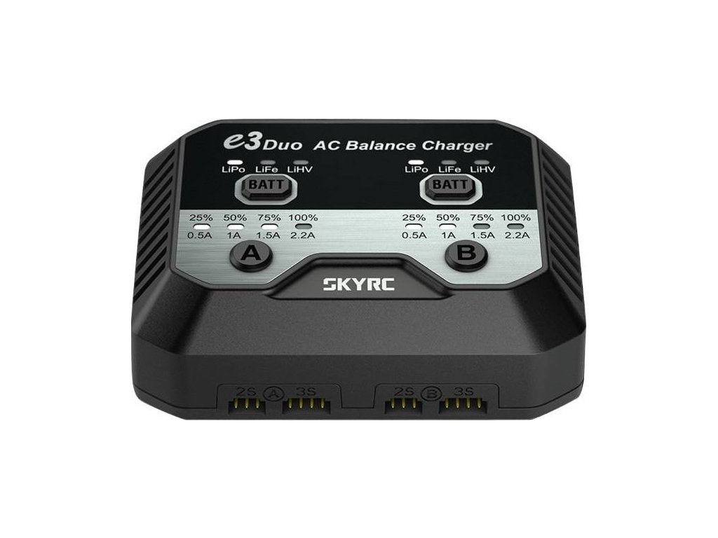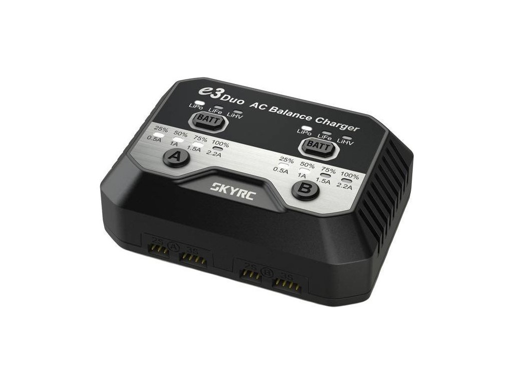Nabíjačka SkyRC e3 Duo je nástupcom dvojkanálovej verzie jednej z najobľúbenejších nabíjačiek SkyRC. E3 Duo umožňuje nabíjať batérie LiPo, Life, LiHV 2-3S s výkonom 20 W na kanál a maximálnym nabíjacím prúdom 2,2 A. Nabíjací prúd prispôsobíte kapacite batérie voľbou príslušnej hodnoty - 0,5, 1, 1,5 alebo 2,2 A.