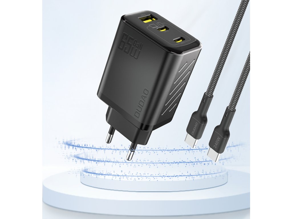 Dudao A29C 65W GaN nabíjačka do siete + USB-C kábel - čierna Dudao A29C je pokročilá nástenná nabíjačka s technológiou GaN, ktorá ponúka výkon až 65 W a podporuje rýchle nabíjanie PD a QC.