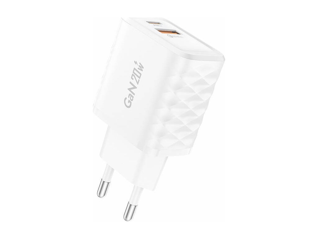 Foneng EU56 1xUSB-A, 1xUSB-C, 20W Power Charger + USB-A to Lightning kábel je pokročilé rýchlonabíjacie zariadenie, ktoré poskytuje maximálny výkon s technológiou GaN (gallium nitrid). Podporuje výkon 20 W a tiež početné protokoly rýchleho nabíjania, ako sú PD2.0/3.0, QC2.0/3.0, AFC, FCP a PPS, vďaka čomu je kompatibilný s väčšinou zariadení na trhu. Port USB-C ponúka rýchle nabíjanie s výkonom 20 W, zatiaľ čo port USB-A poskytuje výkon 18 W s technológiou QC3.0, čo umožňuje nabíjanie dvoch zariadení súčasne. Vďaka jedinečnému dizajnu inšpirovanému rybími šupinami vyzerá nabíjačka elegantne a štýlovo. Vďaka kompaktnej veľkosti je ideálny pre doma aj na cestách a zaručuje rýchle a bezpečné nabíjanie bez prehrievania vašich zariadení.