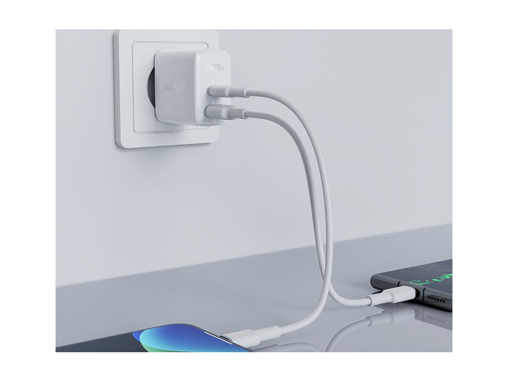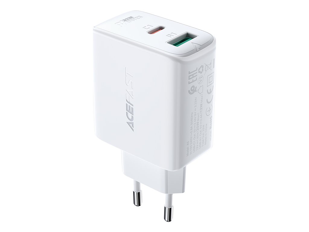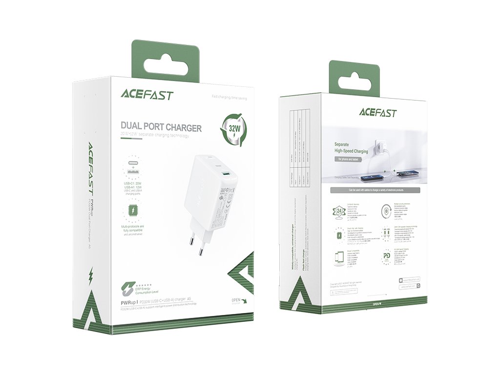 Rýchla nástenná nabíjačka Acefast. Má celkovo 2 porty, USB typu C a USB. Prvý konektor USB typu C s označením „C1“ umožňuje nabíjanie s maximálnym výkonom 20 W a konektor USB A1 až 12 W. Umožňuje rýchle nabíjanie, okrem iného v štandardoch PPS, Power Delivery, Quick Charge 3.0, AFC a FCP. K nej je možné pripojiť 2 zariadenia súčasne. Je vyrobená z ohňovzdorného PC materiálu. Je vybavená mnohými ochranami, ako je prehriatie, prepätie, vysoké napätie alebo preťaženie.