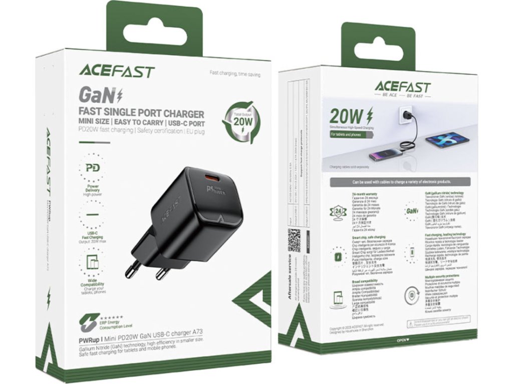 Rýchlonabíjačka Acefast A73 poskytuje okamžité nabíjanie s výkonom až 20 W. Funguje so zariadeniami, ako sú telefóny a tablety. Kompaktný dizajn robí zo sieťovej nabíjačky Acefast A73 ideálneho spoločníka na cesty a zmestí sa do každého batohu alebo kabelky. Technológia GaN zaručuje lepšiu pracovnú efektivitu a nižšiu spotrebu energie.