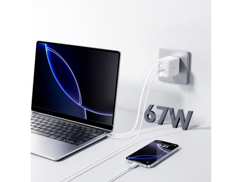 - 67 W výkonu: rýchle nabíjanie notebookov, smartfónov a tabletov – MacBook Air až na 50 % za pol hodiny.
