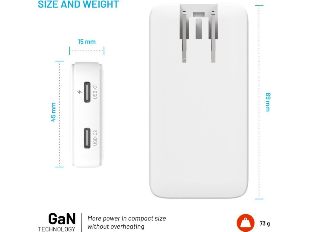 - cestovná nabíjačka s tenkým telom a GaN technológiou
