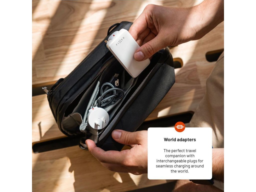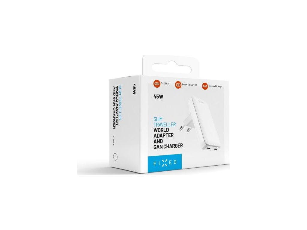 Sieťová GaN nabíjačka FIXED Slim Traveller s 2x USB-C výstupom s vymeniteľnými adaptérmi, 45W, biela