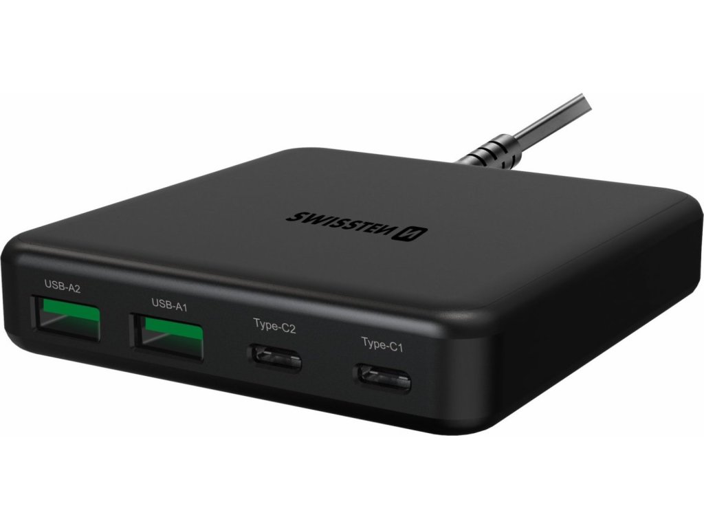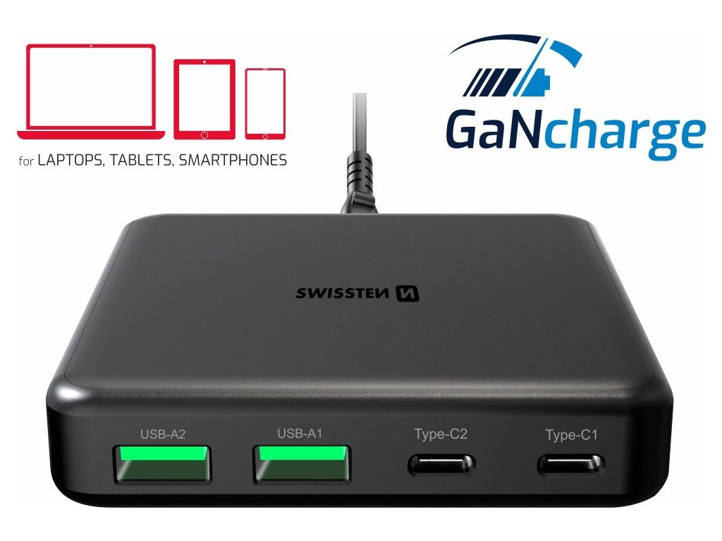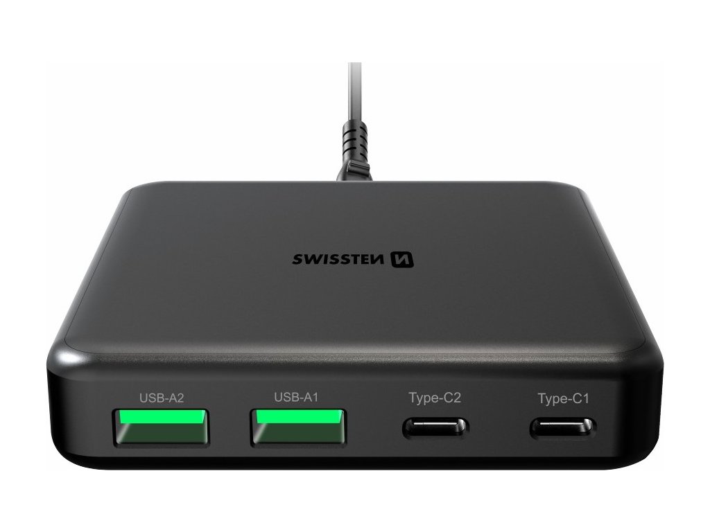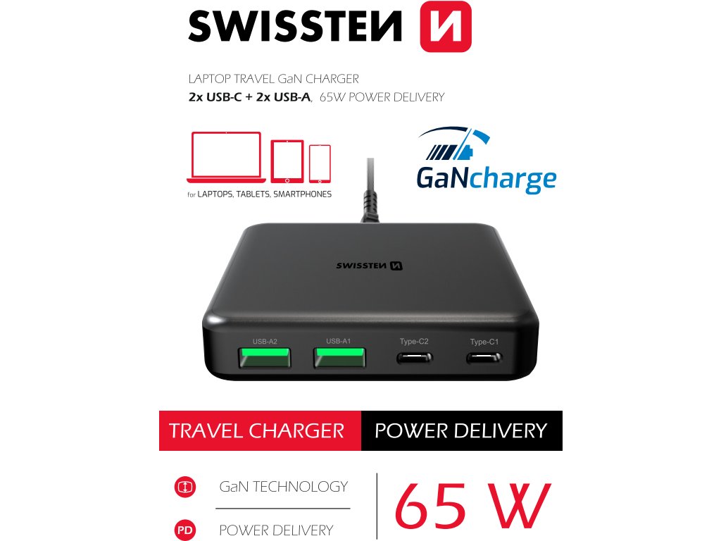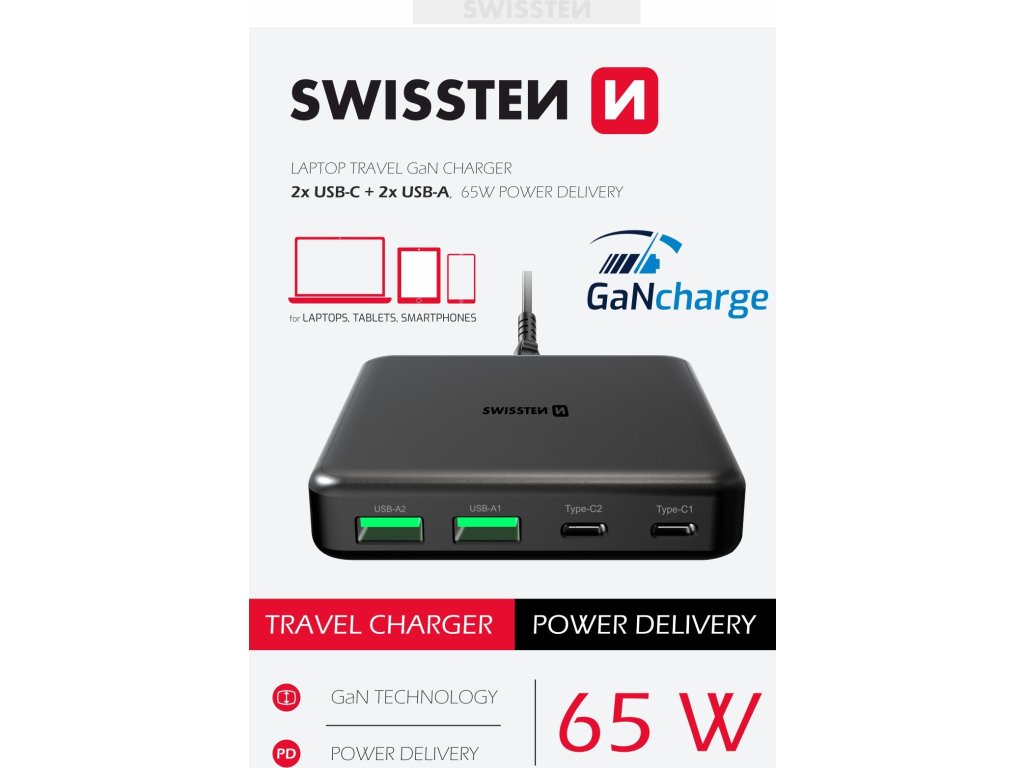 SWISSTEN MINI DESKTOP ADAPTÉR GaN 2x USB-C + 2xUSB 65W POWER DELIVERY ČIERNY