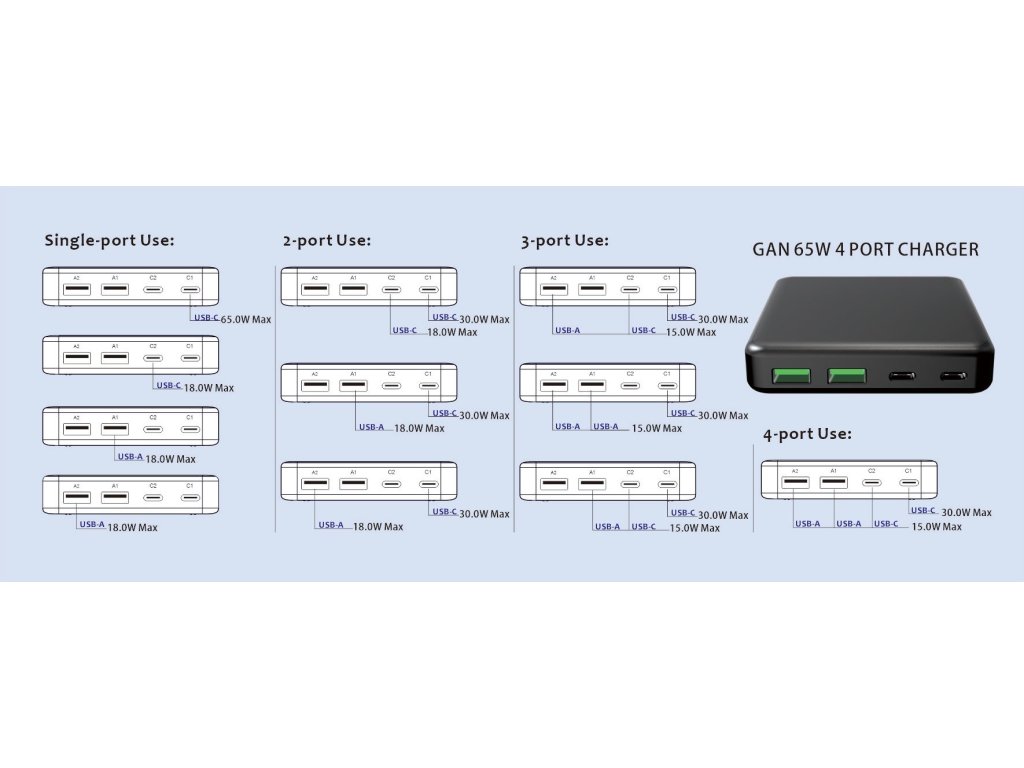 Nabíjačka disponuje vysokým výstupným výkonom 65W z portu USB-C 1. Ostatné porty dobíja maximálnym výkonom 18W a pri pripojení viacerých zariadení sa výstupné výkony jednotlivých výstupných portov optimalizujú.