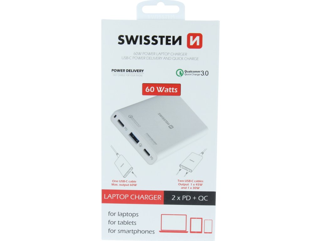 Sieťový adaptér s výkonom 60W na dobíjanie Notebookov a MacBookov. Adaptér je vybavená výstupmi 2XUSB-C s technológiou rýchleho nabíjania POWER DELIVERY pre zariadenia s IOS a 1xUSB s rýchlym nabíjaním Qualcomm pre zariadenia s OS Android. Balené v blistri SWISSTEN.