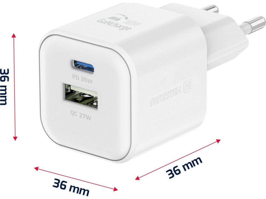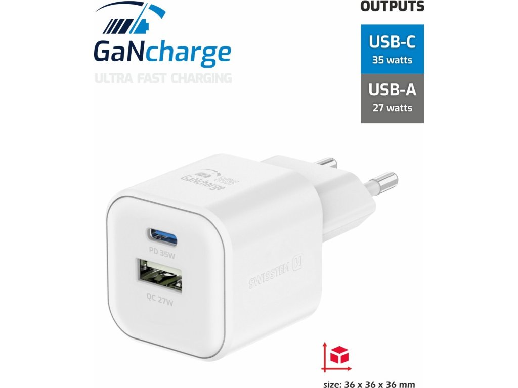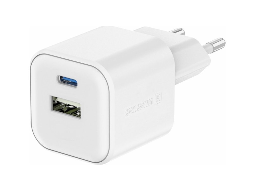 SWISSTEN SIEŤOVÝ ADAPTÉR GaN 1x USB-C 35W PD + 1x USB-A 27W QC BIELÝ