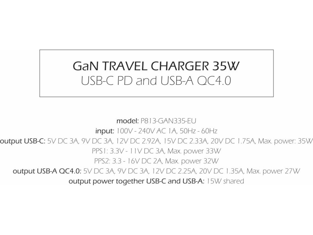 USB-C: DC 5.0V 3.0A, DC 3.0A 9.0V, DC 2.92A DC 12.0V, DC 25.0V DC 2.33A, DC 20V 1.75A, Max. 35W